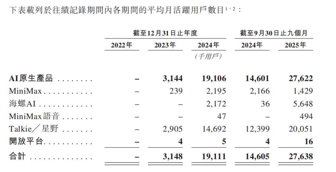 基于C端为主的商业布局,在MiniMax的招股书中,用户量与月活等经营数据是其披露的重点,MiniMax的AI原生产品在2023年的平均MAU约为315万,到2024年实现超六倍增长,达到1911万。截至2025年9月30日,MiniMax拥有2.12亿名个人用户,月活已达2760万。