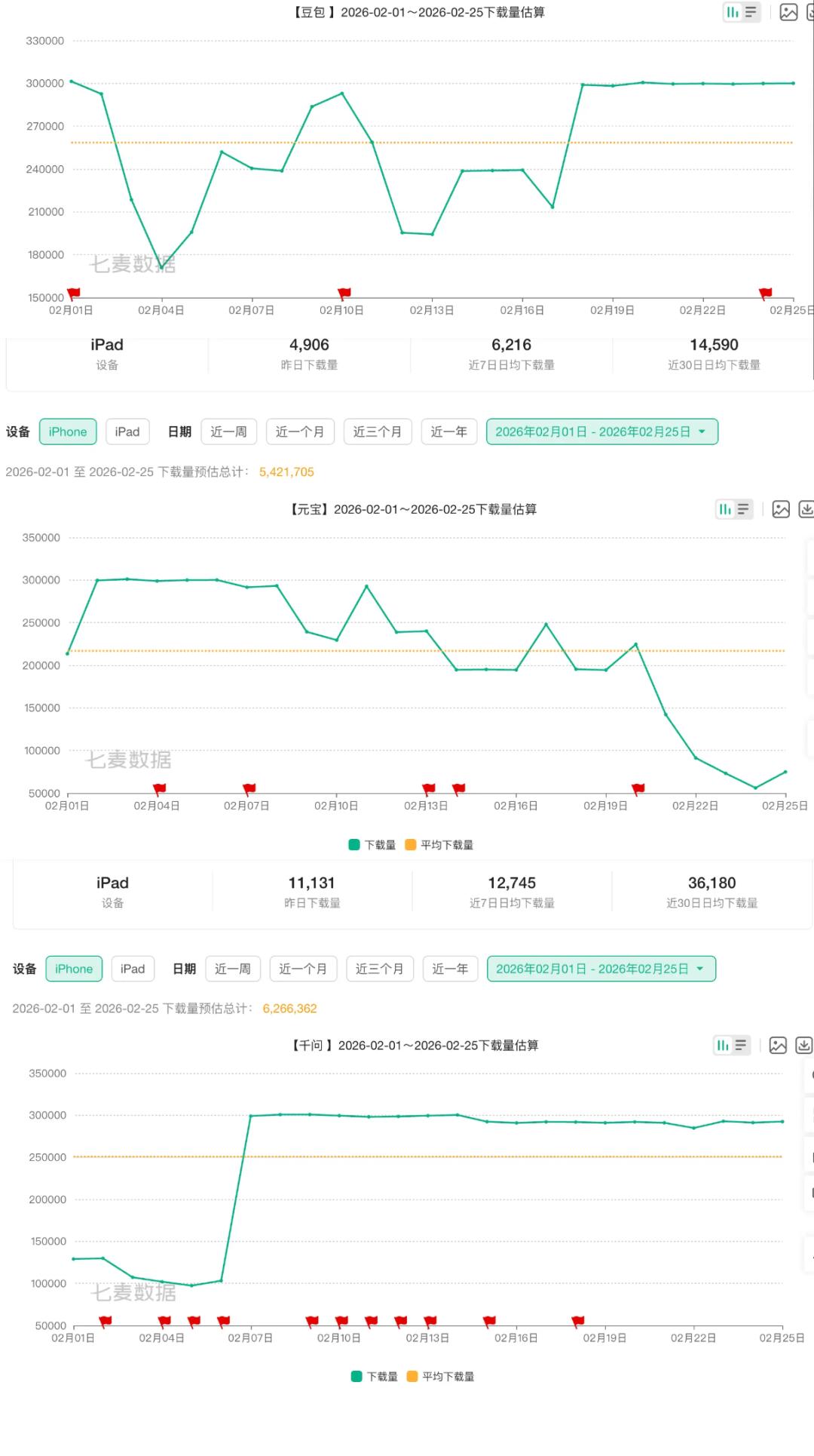但从数据走势能清晰看到,三款应用均呈现节日期间冲高、节后快速回落的趋势,红包福利的引流效应随活动结束快速消退。对比单日下载峰值与节后常态数据,差距显著,直观印证了补贴退潮后的用户流失现状。
