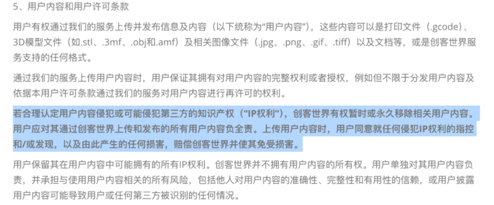 例如拓竹科技在MakerWorld的用户协议中强调若认定用户内容侵犯第三方的IP权利,则其有权移除相关内容,并且要求用户对所上传的内容负责。