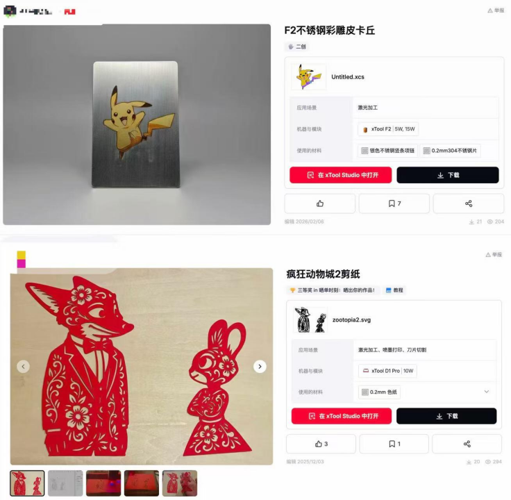 不仅如此,激光雕刻机品牌xTool的社区Atomm中,同样不乏用户在大肆分享任天堂经典IP皮卡丘、疯狂动物城中朱迪和尼克的打印图纸。