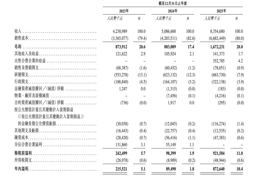 综合两份招股书,2022-2025年,纳真科技的收入分别约50.43亿、42.39亿、50.87亿、83.55亿元;毛利分别约11.17亿、8.74亿、8.83亿、16.72亿元,毛利率分别为22.1%、20.6%、17.4%、20.0%;净利润分别约4.29亿、2.16亿、0.89亿、8.73亿元。