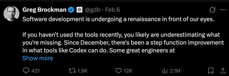 2月6日,OpenAI总裁Greg Brockman在X上公开发了一条面向全公司工程团队的帖子,设了一个deadline:到3月31日,任何技术任务,工程师的第一工具应该是agent,而不是编辑器或终端。