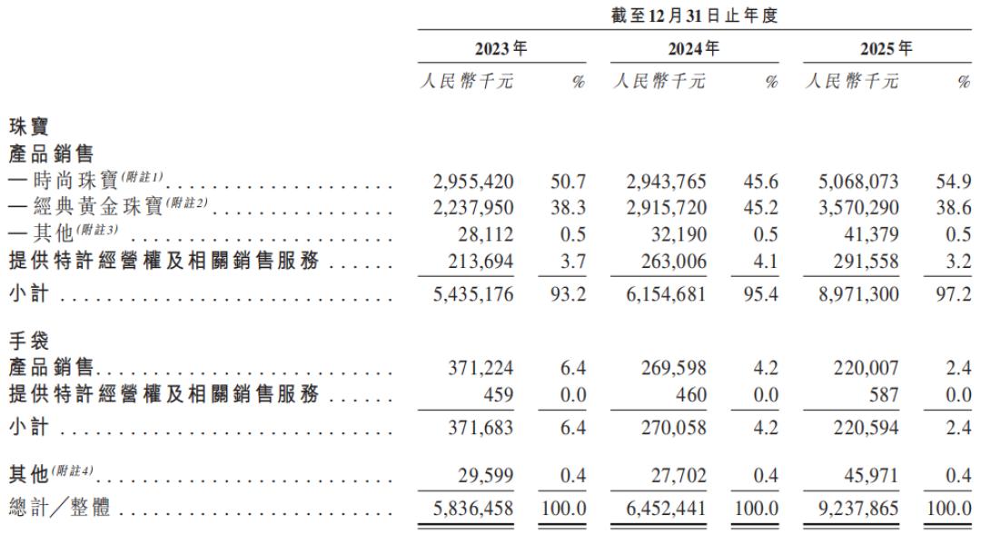 相比之下,手袋业务收入则连续两年出现下滑,从2023年的3.72亿元降至2024年的2.70亿元,再降至2025年的2.21亿元,大幅缩水超过四成,占营收的比例也从6.4%降至2.4%。可以说,潮宏基此前“珠宝+女包”的双主业布局几乎名存实亡,珠宝业务的增长韧性,已成为决定潮宏基业绩走向与长期发展的主要因素。