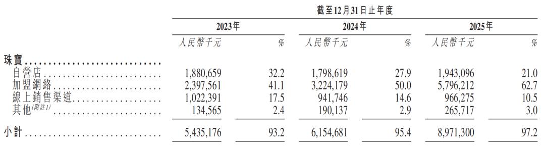 渠道模式持续调整也是更新后的招股书中最值得关注的亮点。截至2025年,潮宏基共拥有1670家线下珠宝门店,其中包括184家自营门店和1486家加盟门店,此外还有11家海外门店。
