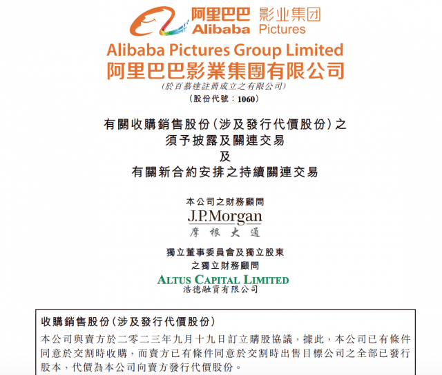 9月19日消息,阿里影业在港交所披露公告称,与阿里集团全资子公司阿里巴巴投资有限公司签订股份购买协议,阿里影业将附条件收购经营“大麦”品牌的Pony Media Holdings Inc.(“目标公司”)的全部股权。