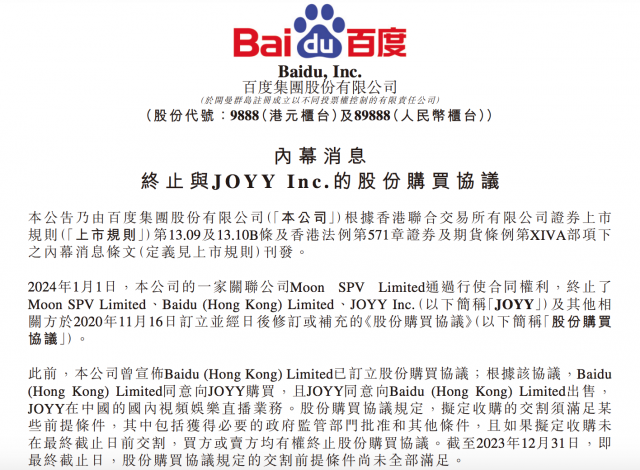 2024年1月1日,百度在港交所发布公告,公司的一家关联公司Moon SPV Limited通过行使合同权利,终止了Moon SPV Limited、Baidu (Hong Kong) Limited、JOYY Inc.及其他相关方于2020年11月16日订立并经日后修订或补充的《股份购买协议》。