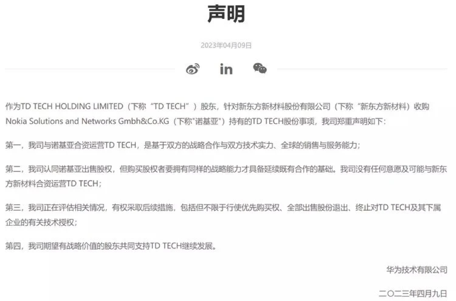 鼎桥通信的身份颇为特殊,这是一家由诺基亚和华为合资运营的公司,目前诺基亚和华为分别持有51%、49%股权。2023年4月,A股上市公司东方材料公告将收购诺基亚持有的鼎桥通信股份,遭到华为的激烈反对。华为发布了一份措辞毫不留情面的声明,称其没有任何意愿及可能与新东方新材料合资运营鼎桥通信。华为还表示,期望与“有战略价值的股东”共同支持鼎桥通信继续发展。