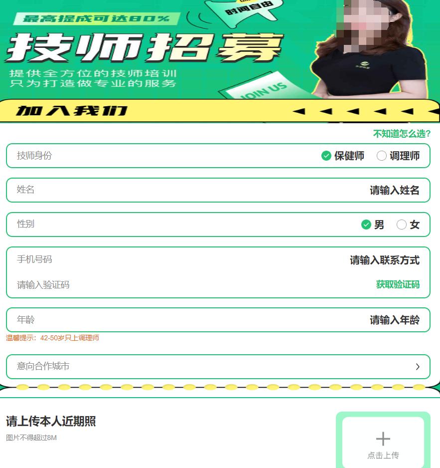 在东郊到家“技师招募”页面中,创投日报记者注意到,加入东郊到家仅需填写技师身份、姓名、性别、联系方式、年龄以及意向合作城市等信息,且上传本人近期照。对于技师资质,没有在页面中有任何要求。