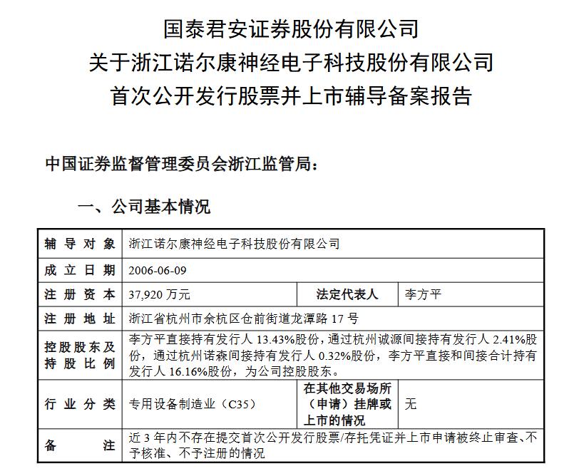 11月28日,浙江诺尔康神经电子科技股份有限公司(以下简称“诺尔康”)办理辅导备案登记,拟首次公开发行股票并上市,辅导券商为国泰君安。