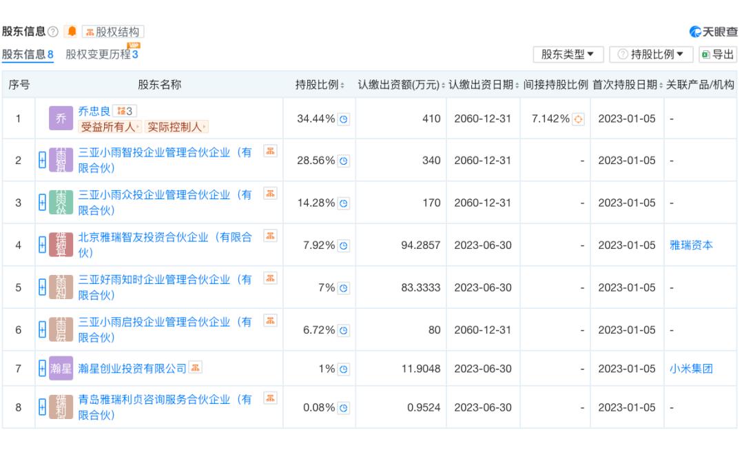 北京小雨智造科技有限公司成立于2023年1月,由小米集团的核心创始团队创立。其中,创始人乔忠良,系小米初创成员之一,曾担任MIUI研发负责人,负责MIUI9到MIUI12等产品。