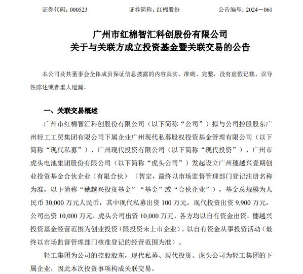 12月14日,红棉股份发布公告,拟与公司控股股东广州轻工工贸集团有限公司下属企业现代私募、现代投资、虎头公司发起设立广州穗越兴壹期创业投资基金合伙企业(有限合伙)(以下简称“穗越兴投资基金”)。