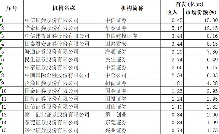 虽然行业格局未发生明显变化,但中信证券、中信建投、国泰君安、海通证券、民生证券的首发承销保荐费均较去年下降超78%。
