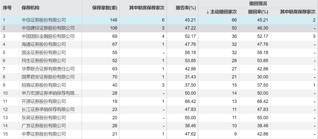 在保荐数量超20家的券商中,撤回率最高的为国金证券,为58.18%;民生证券、海通证券分别以53.85%、52.17%的撤回率位居前二、三名。