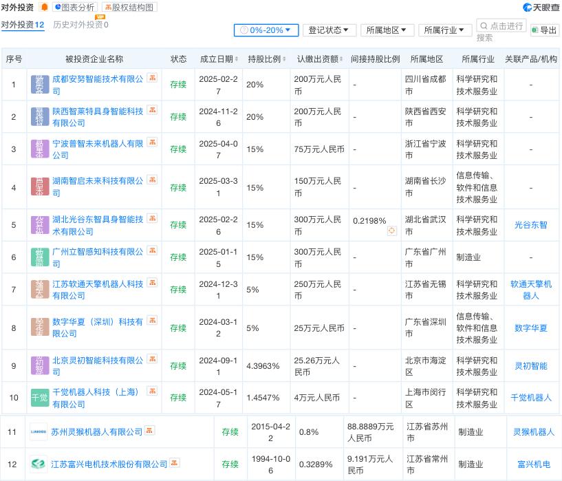 天眼查App信息显示,包括灵猴机器人在内,智元机器人自2024年7月至今,已对外投资了数字华夏、富兴电机、灵初智能、陕西智莱特(陕西亿智动能持股40%)、软通天擎机器人、立智感知、千觉机器人、光谷东智、成都安努智能(四川富临实业集团成员,富临精工持股40%)、湖南智启未来(蓝思科技控股70%)、宁波普智未来(均胜集团成员公司控股85%,以下简称:普智未来),共计12家公司,持股比例从0.3289%-20%不等。