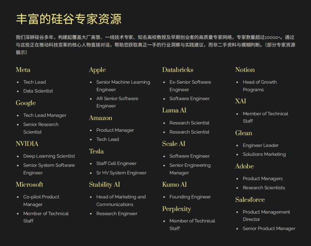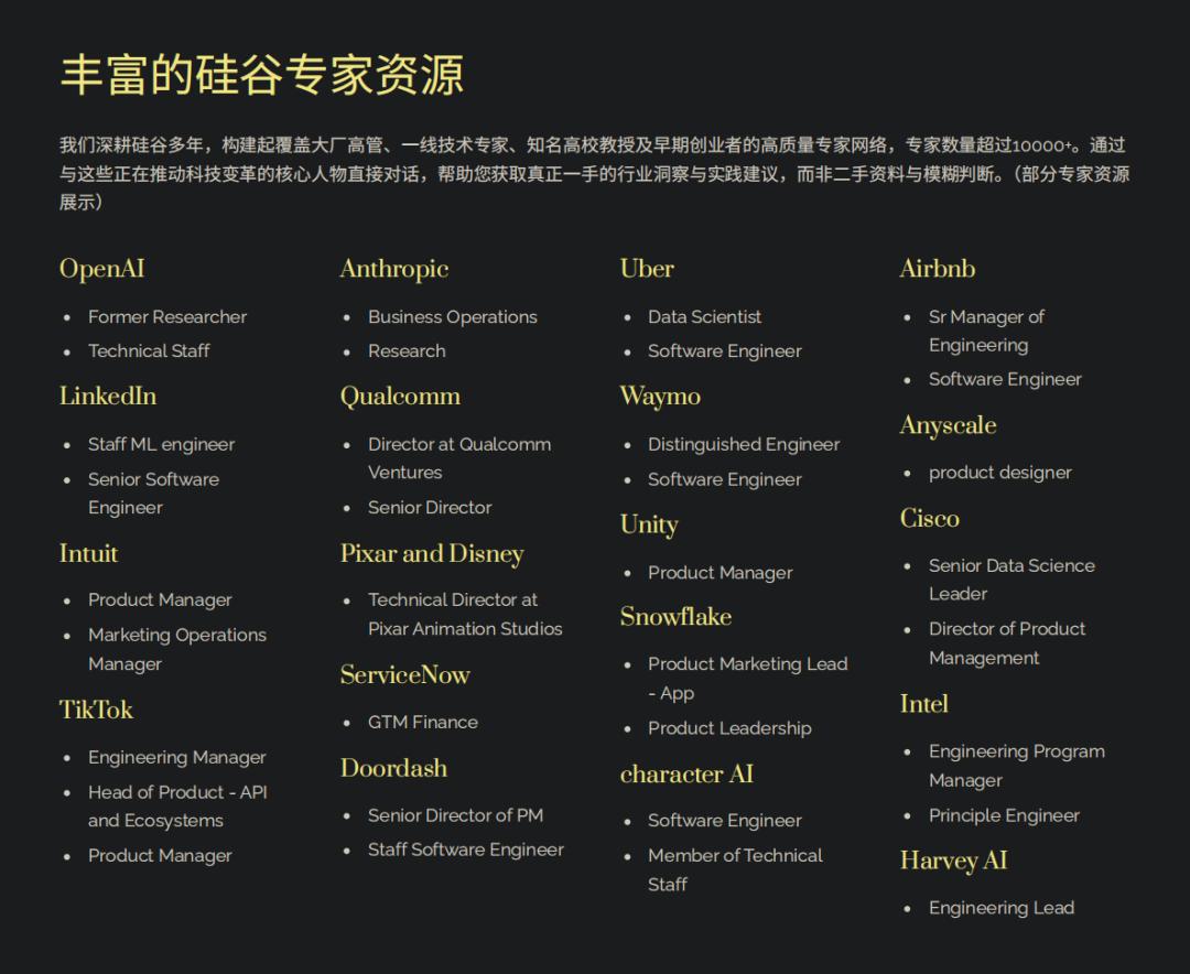 我们拥有超过30,000名来自硅谷一线的大厂高管、核心技术专家、知名高校教授与创业者。他们不仅拥有深厚的行业经验,更深度参与着产业变革,具备鲜活、可信的一手洞察。