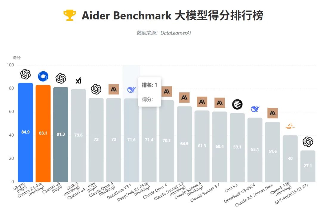 编程能力超越Claude 4 Opus: 在权威的Aider编程基准测试中,V3.1以71.6%的高分,超越了此前公认的编程强者ClaudeOpus 4,登顶开源模型榜首。