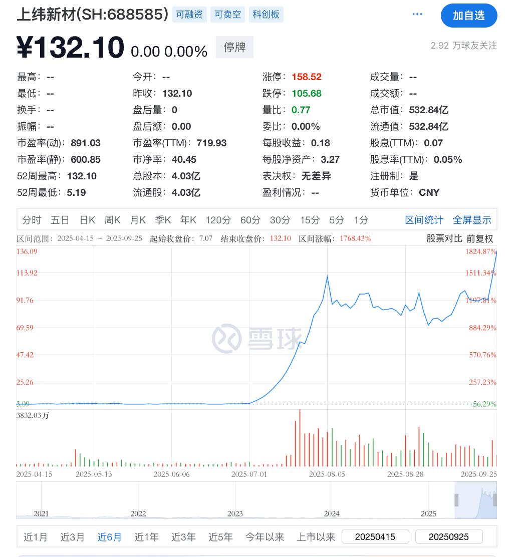 即便如此,二级市场的热情却仍未平息。自7月9日复牌后,上纬新材连续斩获11个“20cm”涨停,刷新科创板连板纪录。停牌核查前一个交易日(9月25日),上纬新材又获“20cm”涨停,收盘价报132.1元/股,再次创历史新高,总市值达532.84亿元。