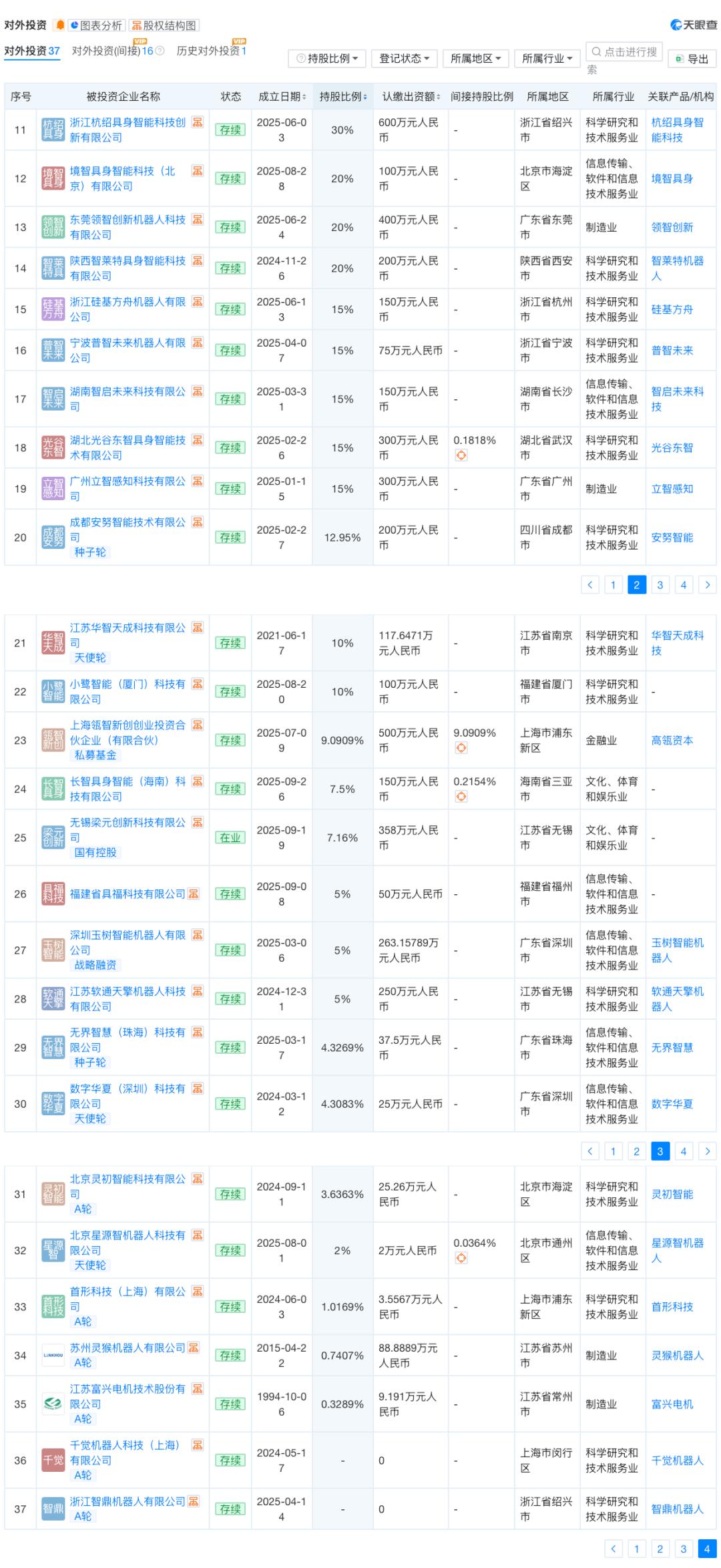 天眼查App信息显示,2024年7月至今,智元对外投资标的包括:杭绍具身智能科技、境智具身、领智创新、智莱特机器人、硅基方舟、普智未来、智启未来科技、光谷东智、立智感知、安努智能、华智天成科技、玉树智能机器人、软通天擎机器人、无界智慧、数字华夏、灵初智能、星源智机器人、首形科技、灵猴机器人、富兴电机、千觉机器人、智鼎机器人……持股比例从0.3289%-30%不等。