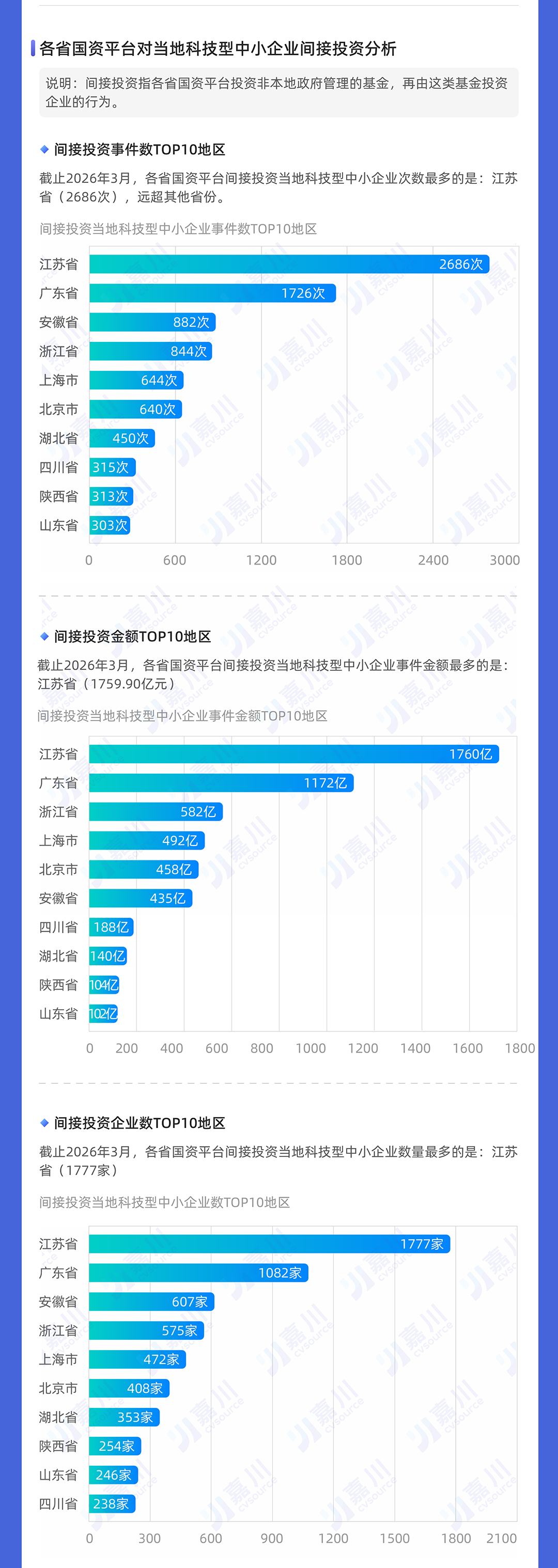 站在省级层面。江苏国资直投事件数量1912起、直投金额963.95亿元、直投企业数量1529家,都排在全国第一。广东省三项数据排在第二,安徽则都排在全国第三。
