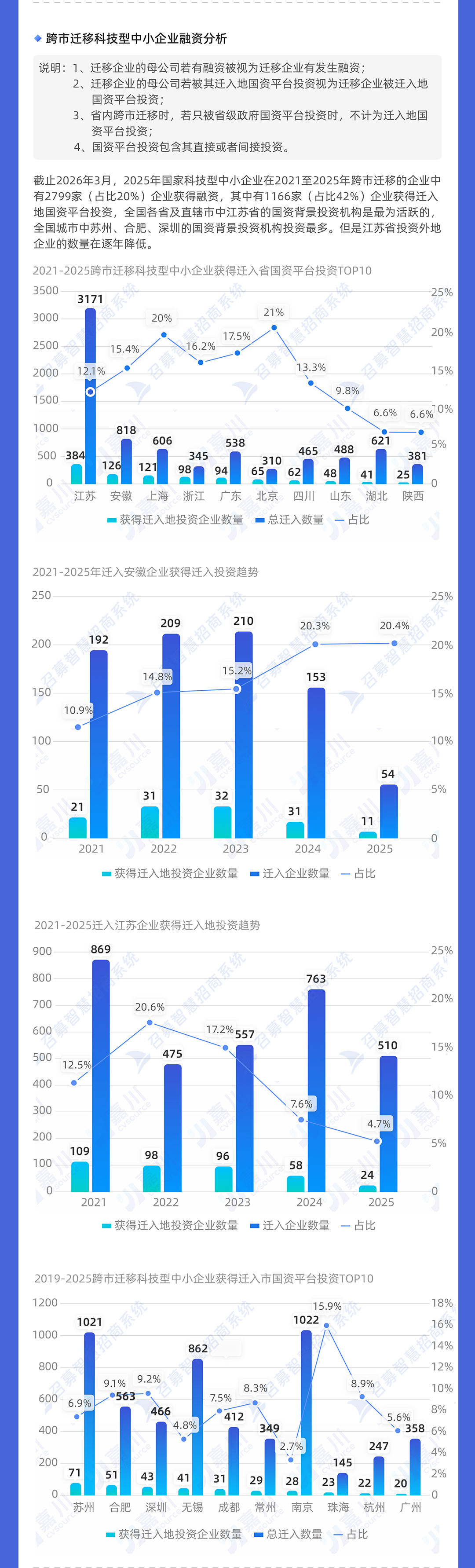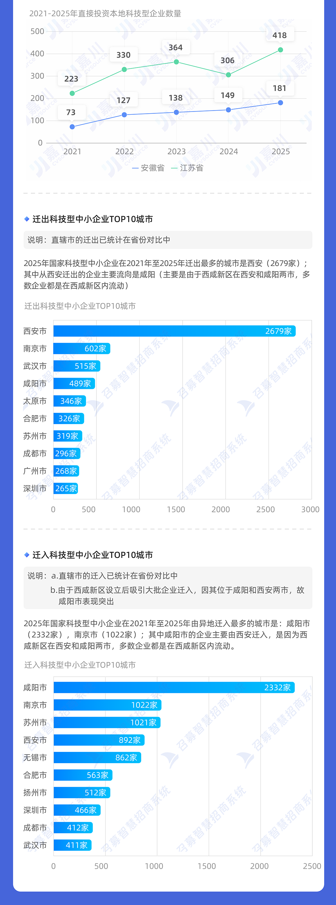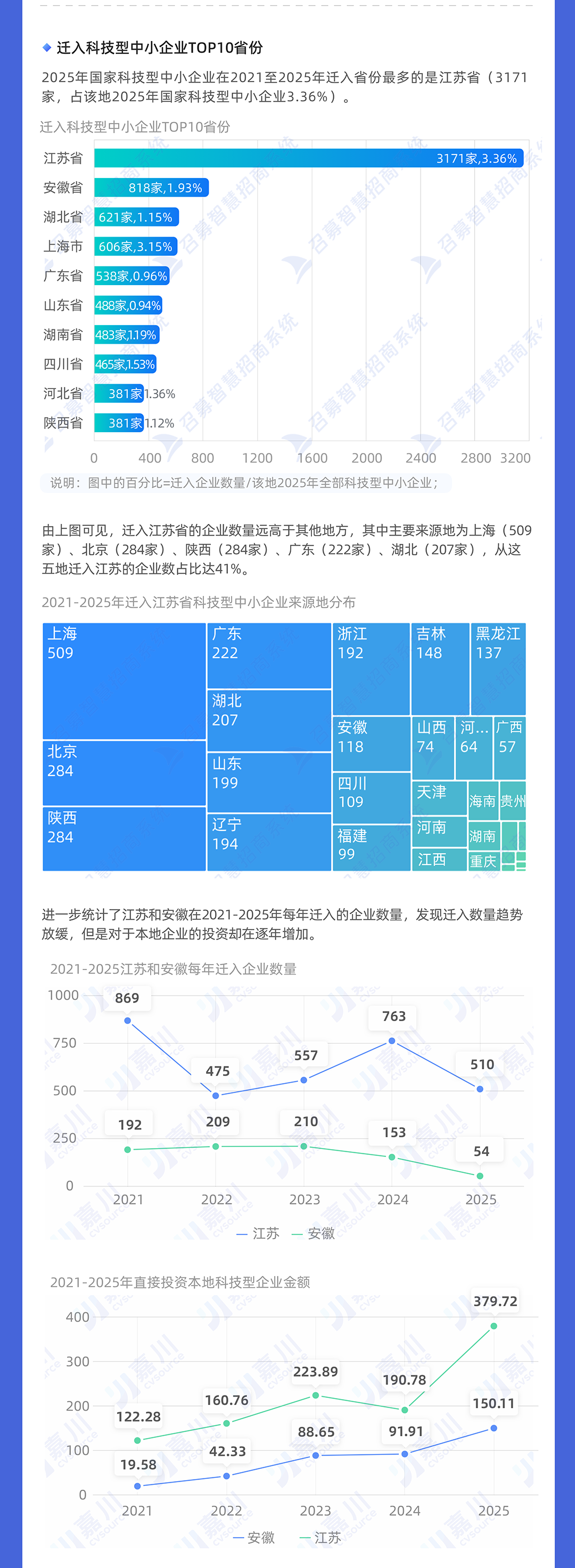 2021年江苏有869家科技型企业迁入,但是去年只有510家企业迁入。安徽2021年192家迁入,但去年只有54家迁入。湖北2021年有158家迁入,但是去年仅有40家。