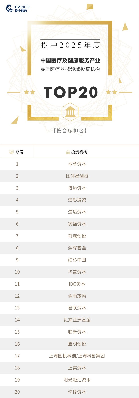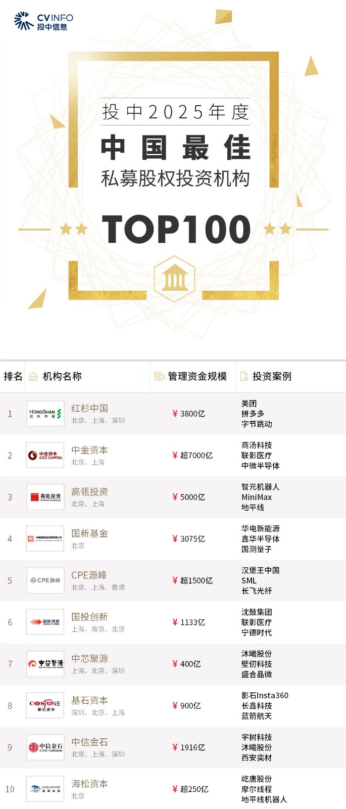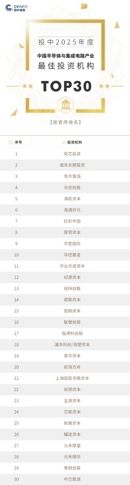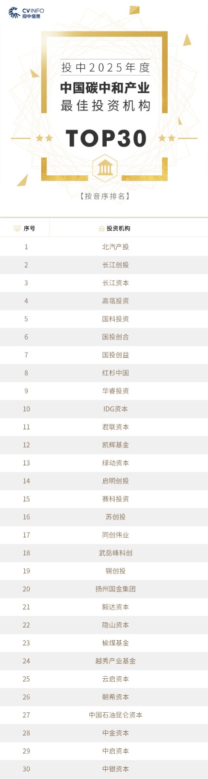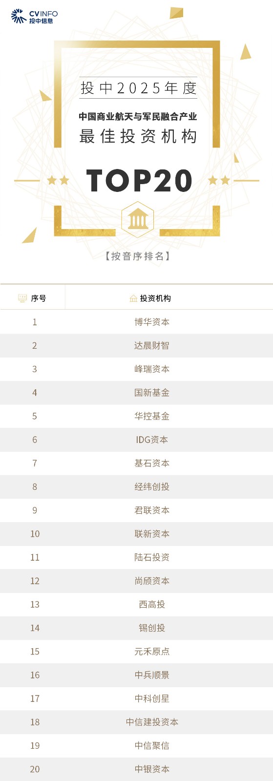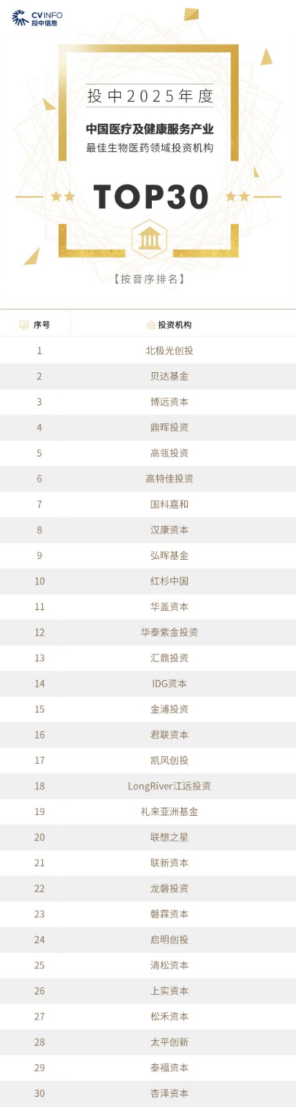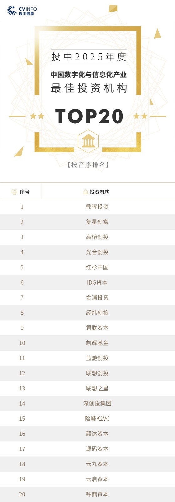 投中信息连续20年作为独立的第三方机构发布中国创业投资机构暨私募股权投资系列榜单——“投中榜”。依托投中嘉川CVSource,结合对超千家私募股权领域活跃投资机构调研,投中研究院参照评选标准复核数据、甄选优秀机构。因此,“投中榜”在业内能以专业、权威和严谨著称,被称为国内股权投资行业的风向标,并且是诸多大型机构LP的重要出资依据。本次榜单共揭晓“2025年度中国最佳创业投资机构”、“2025年度中国最佳私募股权投资机构”、“2025年度中国最佳早期创业投资机构”、“2025年度中国最佳产业投资机构”等奖项。