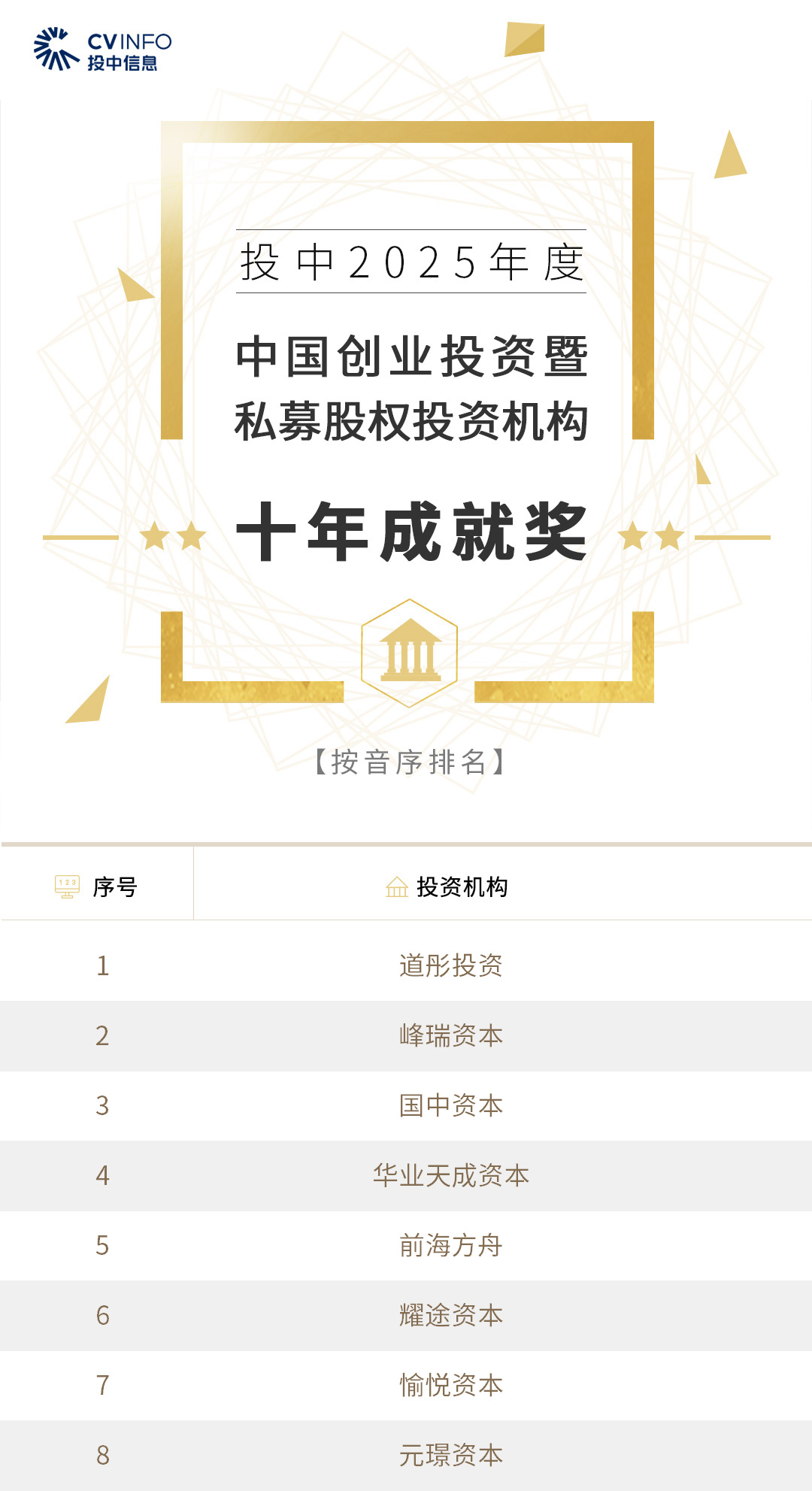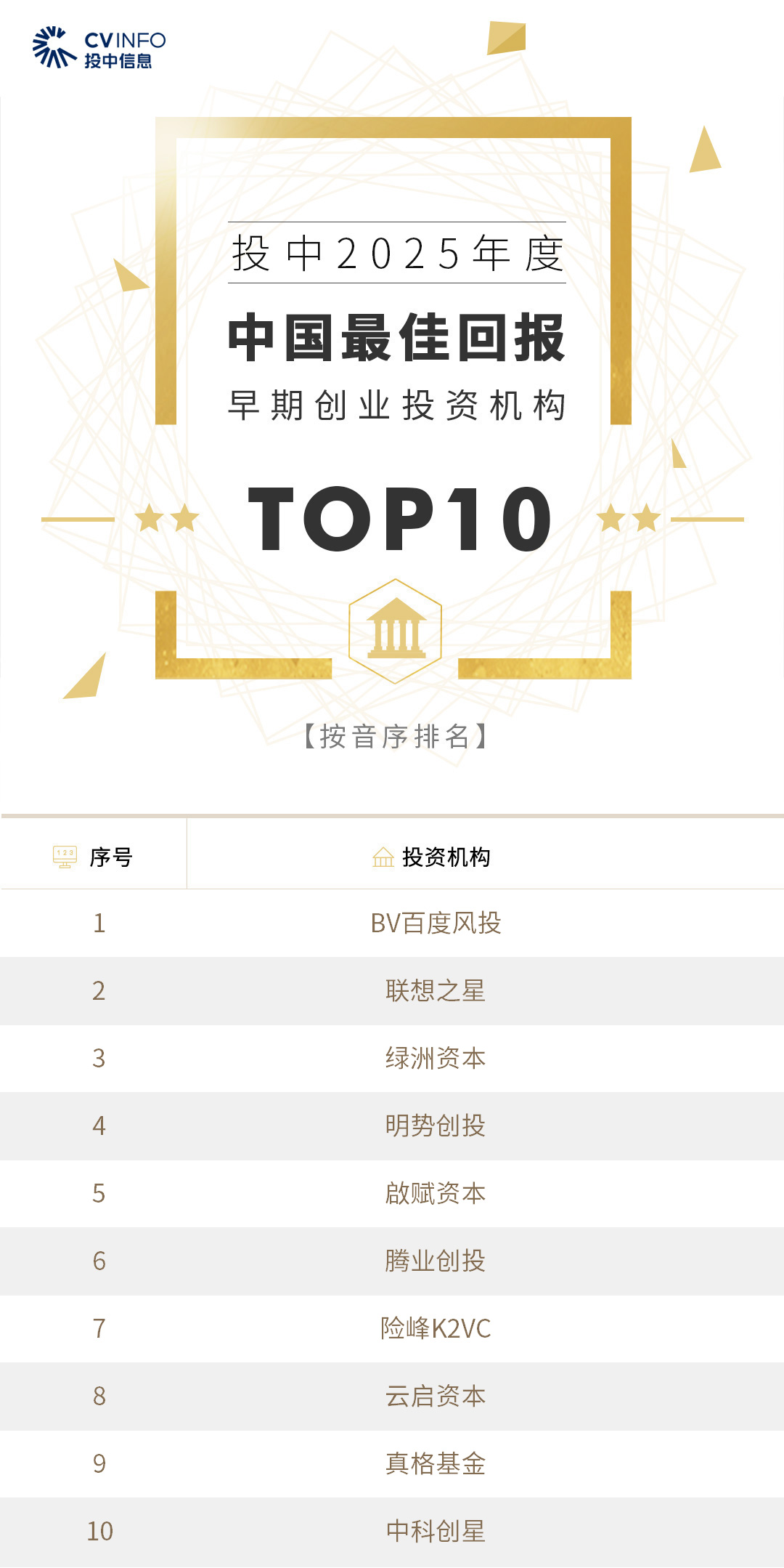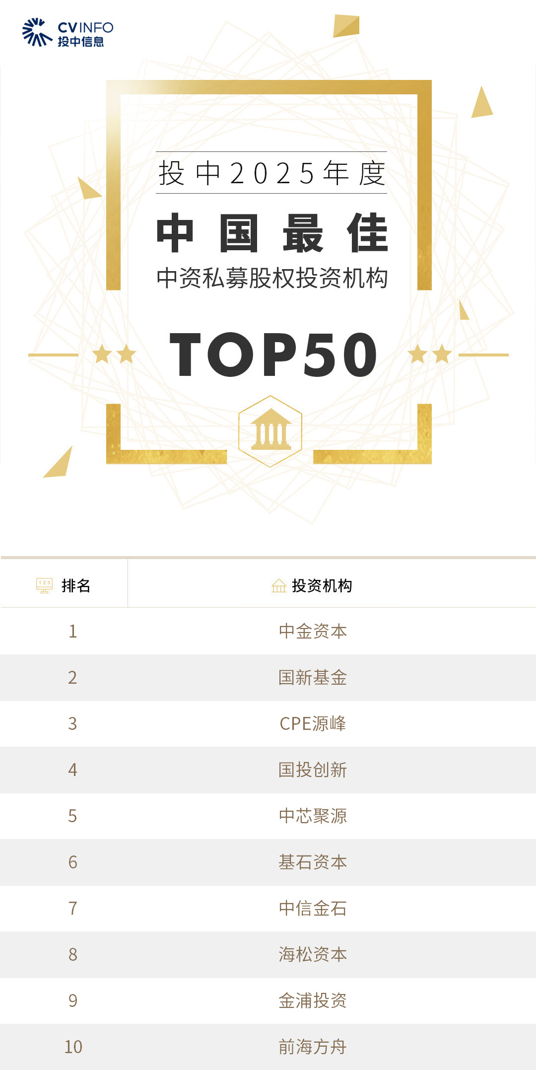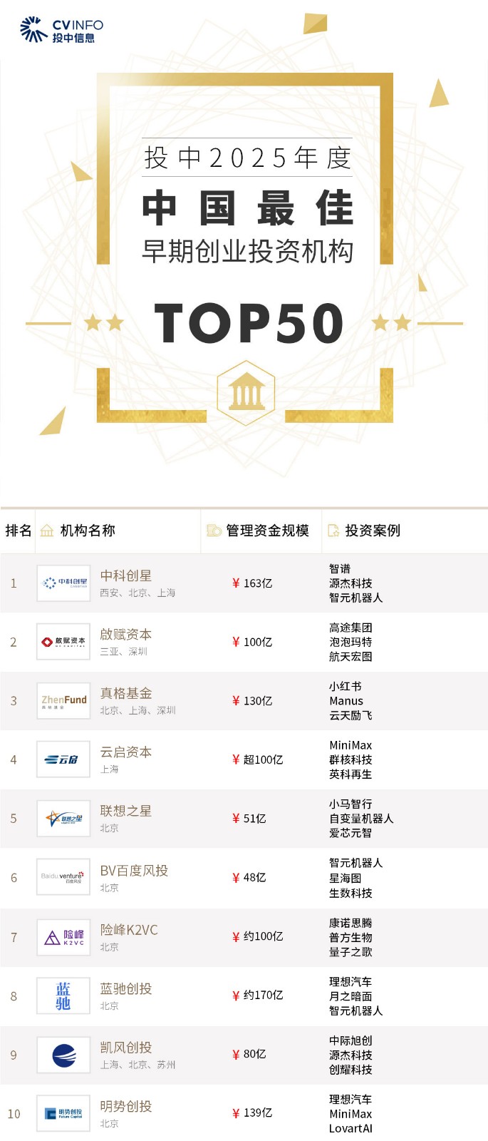投中信息连续20年作为独立的第三方机构发布中国创业投资机构暨私募股权投资系列榜单——“投中榜”。依托投中嘉川CVSource,结合对超千家私募股权领域活跃投资机构调研,投中研究院参照评选标准复核数据、甄选优秀机构。因此,“投中榜”在业内能以专业、权威和严谨著称,被称为国内股权投资行业的风向标,并且是诸多大型机构LP的重要出资依据。本次榜单共揭晓“2025年度中国最佳创业投资机构”、“2025年度中国最佳私募股权投资机构”、“2025年度中国最佳早期创业投资机构”、“2025年度中国最佳产业投资机构”等奖项。