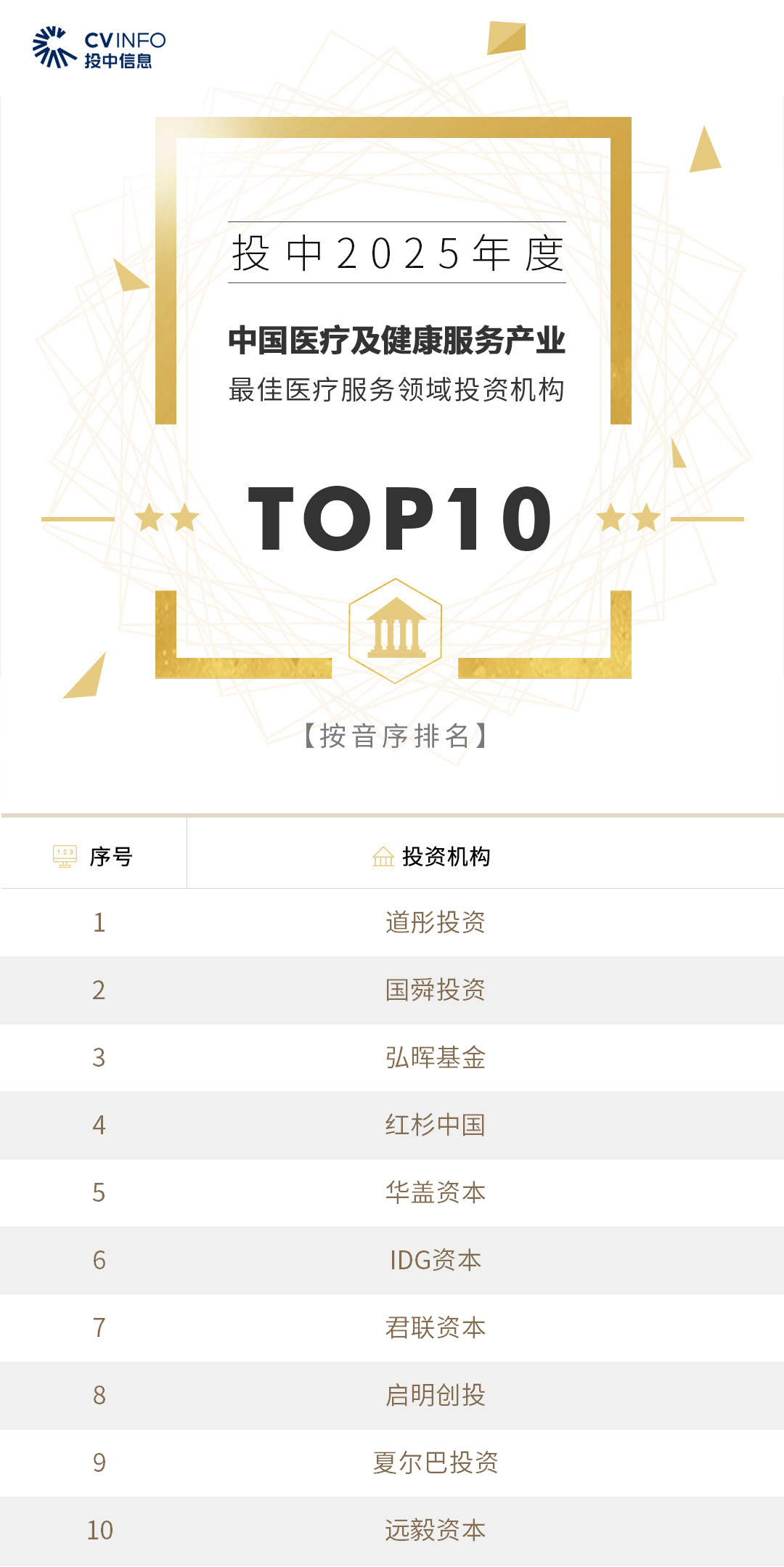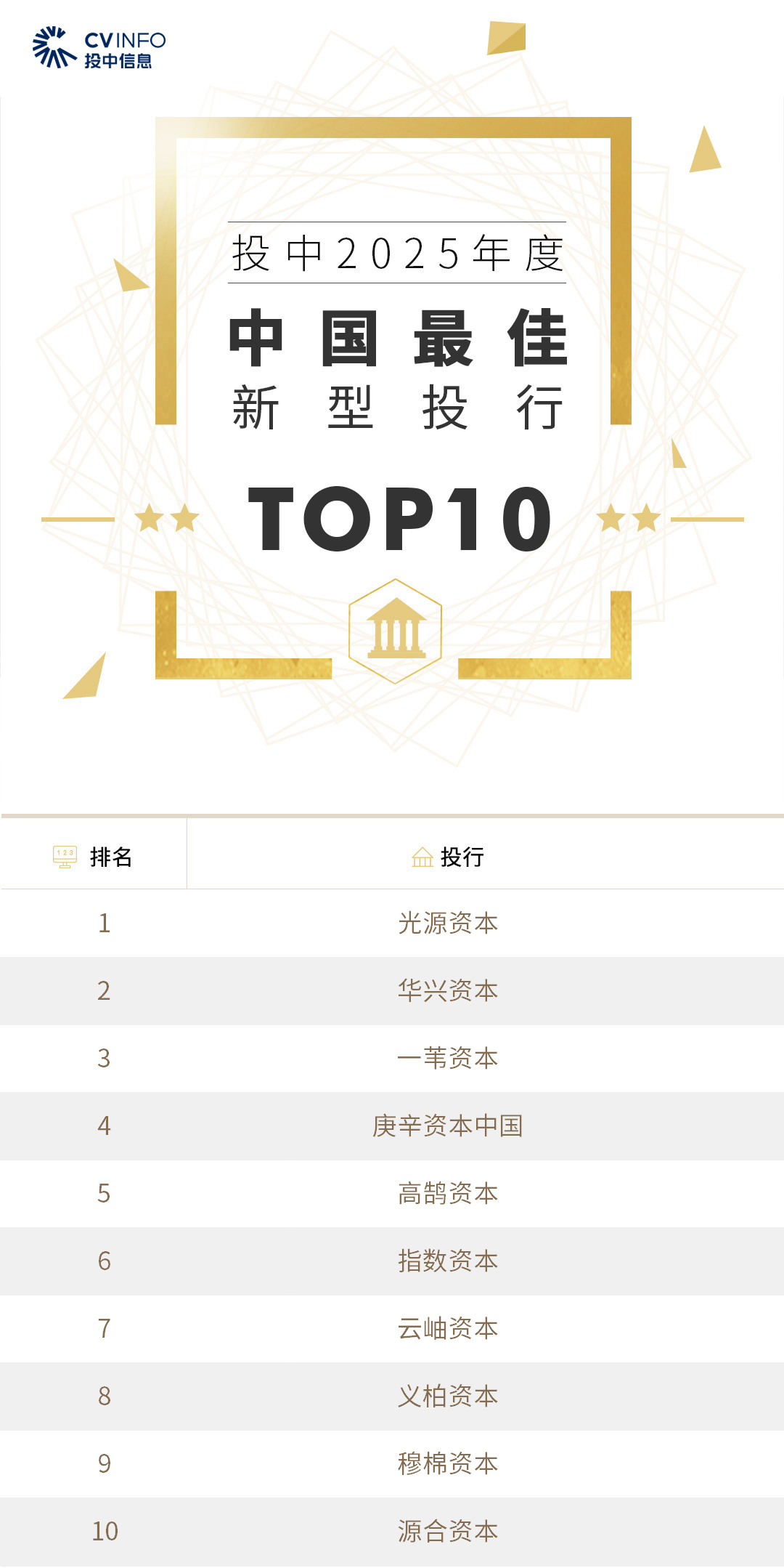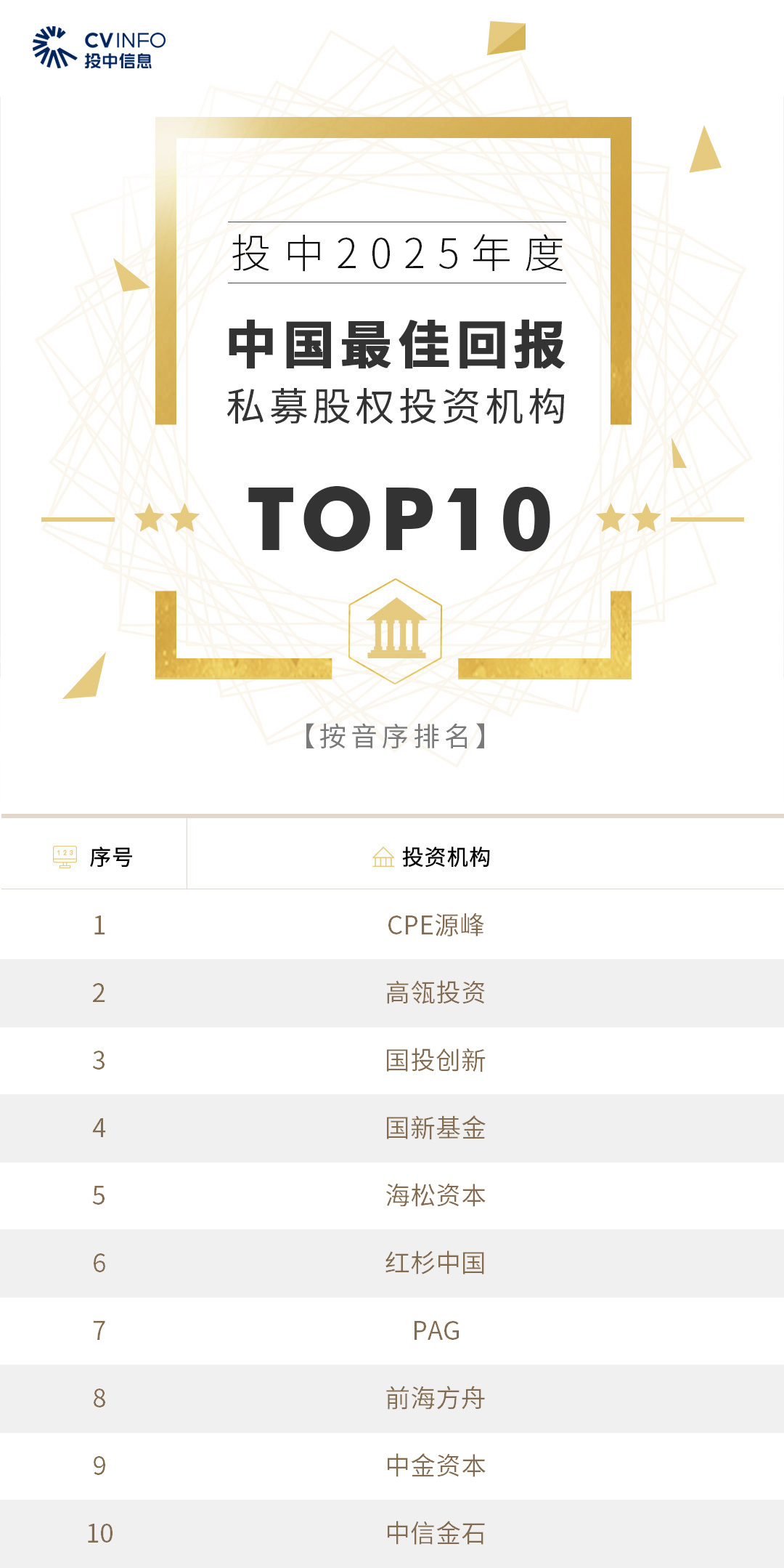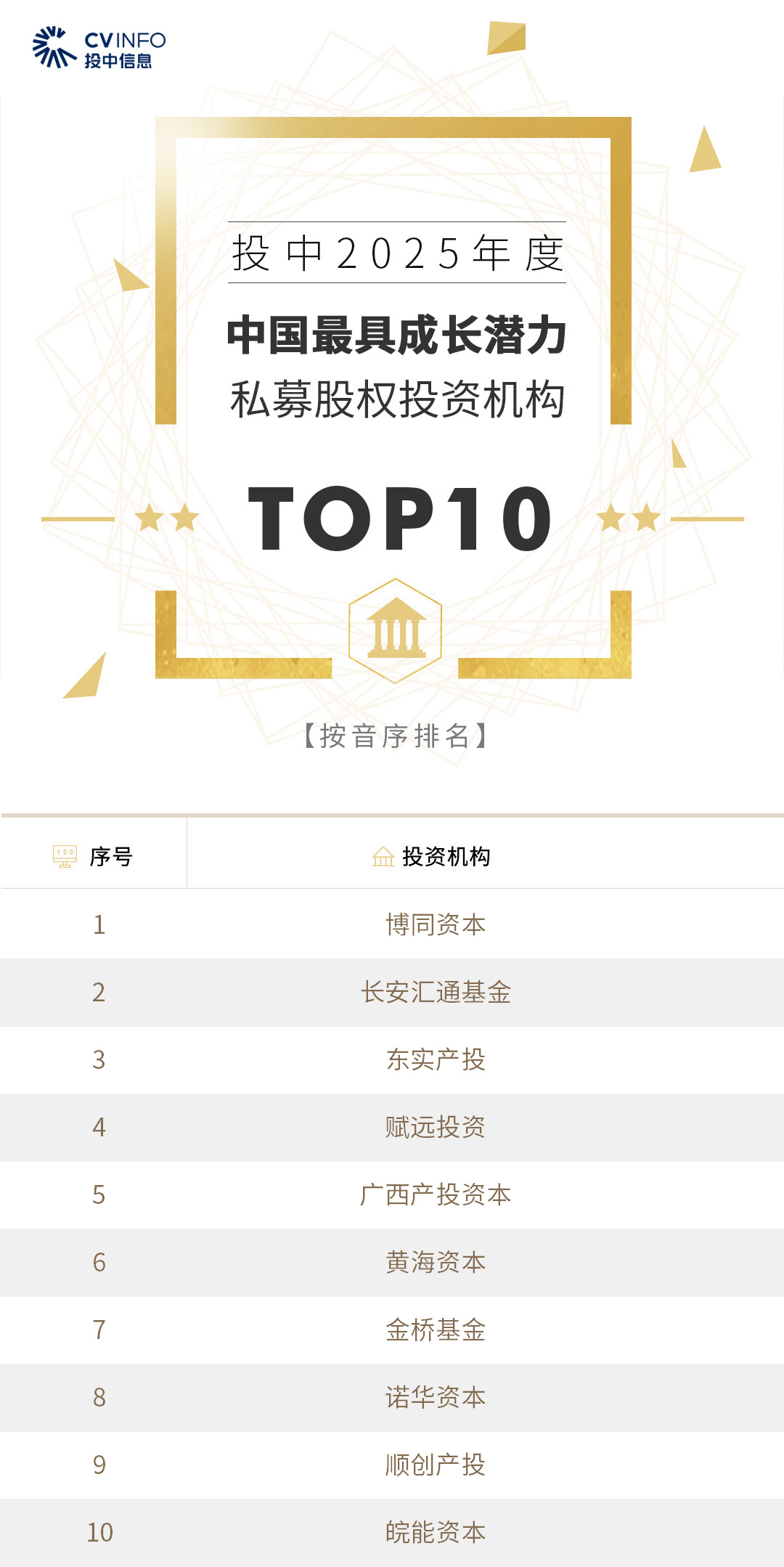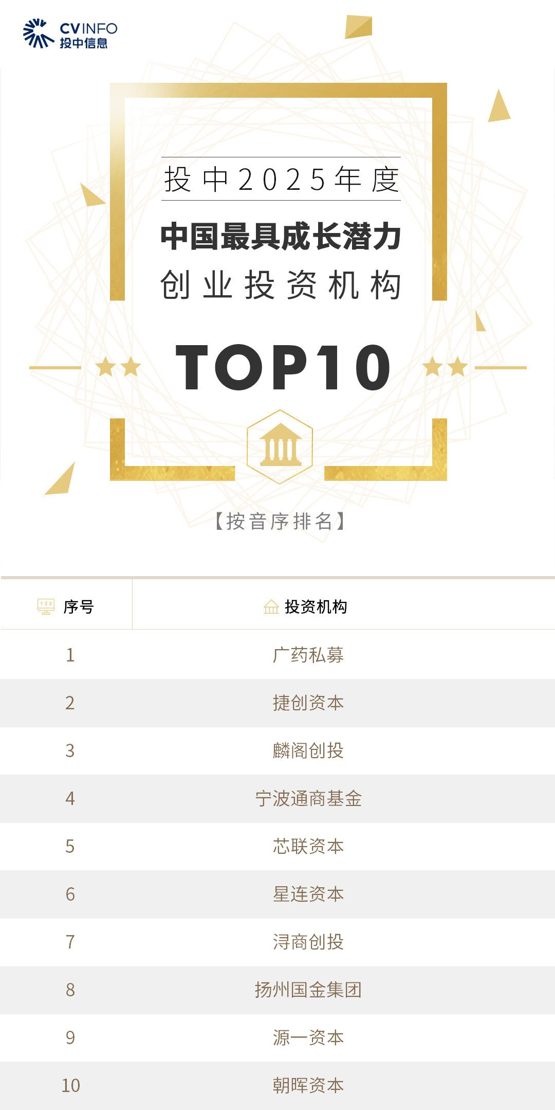 投中信息连续20年作为独立的第三方机构发布中国创业投资机构暨私募股权投资系列榜单——“投中榜”。依托投中嘉川CVSource,结合对超千家私募股权领域活跃投资机构调研,投中研究院参照评选标准复核数据、甄选优秀机构。因此,“投中榜”在业内能以专业、权威和严谨著称,被称为国内股权投资行业的风向标,并且是诸多大型机构LP的重要出资依据。本次榜单共揭晓“2025年度中国最佳创业投资机构”、“2025年度中国最佳私募股权投资机构”、“2025年度中国最佳早期创业投资机构”、“2025年度中国最佳产业投资机构”等奖项。
