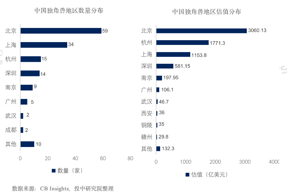 全球独角兽主要集中在中美两国,占近八成比例。投中研究院梳理发现,截止2018年年末全球累计有326家独角兽公司。其中中国有150家,美国107家,中美两国占比达到78.83%,依旧占据着绝对优势。对创业企业而言,这意味着中美两国拥有更好的创业投融资环境。中国独角兽数量已经超越美国。根据投中研究院统计,截止2018年12月31日,中国累计有150家独角兽公司,总估值7150 亿美元,平均估值 47.67亿美元。美国创投研究机构CB Insights跟踪的全球独角兽数据中,对美国独角兽的统计数据里包含了超过10年的机构,在此报告中,为了更能反映过去10年内全球独角兽企业的发展情况,我们采用窄口径统计。因此投中研究院在美国创投研究机构CB Insights统计数据基础上,去掉超龄独角兽后发现,截止2018年12月31日,美国独角兽公司数量为107家,总体估值4686亿美元,平均估值43.79亿美元。中国独角兽数量已经超越了美国。这主要有两大原因:一是中国人口基数大,市场庞大且广阔,这为独角兽的孕育提供了天然条件,特别是在电商、交通出行、物流等行业。二是中国独角兽受资本驱动的影响大。依靠政府资金和诸如BAT等大公司的单一资金就可以达到独角兽的估值门槛,根据统计,有近50%的中国独角兽企业背后有腾讯、阿里巴巴或百度的投资。02中美独角兽地区分布:中国集中北上杭深、美国集中湾区、纽约对比中美独角兽的地区分布情况,我们发现独角兽多诞生于拥有相对成熟的创企生态系统的地区。这些地区产业与人口高度密集,资本、技术和人才优势显著,政策支持力度大,创业企业容易形成集群。中国独角兽依旧最大程度地集中在北京、上海、杭州和深圳地区。四地企业数量总占比81%,估值总占比91.83 %。其中,北京59家,占比43.7%,估值总和3060.13亿元人民币;其次是上海34家,占比25.2 %,估值总和1153.8亿元人民币。杭州和深圳各以15家和14家紧随其后,但杭州地区的估值总和高达1771.3亿美元,甚至超越上海,这主要是因为杭州地区有蚂蚁金服这一高估值独角兽的存在,贡献了1500亿美元的估值。总体而言,这四个城市经济发达,科研实力雄厚,人才储备充分,政策优惠度高,创投生态环境较为优越。同时,南京、广州、武汉等新兴城市也诞生了一些独角兽。这些城市近年在为创业者拓宽创业融资渠道、创业奖励、人才留存等方面创造了有力条件。南京地区创投数据尤其亮眼,共录得独角兽企业9家,在数量和估值上均位列第五。2018年是南京推进创新名城建设的起步之年,在“121”战略、一号文件“1+45”政策体系等支撑和保障下,南京全年高新技术企业净增1282家,增长70%,总数达3126家;全年新增科创型企业数量2.4万家,增长17%;累计签约市场化运行的新型研发机构208个,其中正式备案108个,孵化引进企业951家。而美国的独角兽,主要集中在西海岸的加利福尼亚州(73家)和东部的纽约州(11家),其次是马萨诸塞州(8家)和伊利诺伊州(4家)。美国西海岸,特别是加利福尼亚州的旧金山湾区,依托硅谷高科技企业的发展,吸引了世界各国一流的科技创新人才在此集聚,共有38家独角兽企业,占整个加利福尼亚州的52%。周边大学和研究机构和政府组建的高新技术孵化器为独角兽的诞生提供了天然条件。同时,湾区对创新企业的政策支持、发达的风险投资、完善的产业布局也是旧金山湾区引领世界独角兽格局的重要原因。纽约作为美国乃至世界的顶尖城市和经济中心,在资本、技术方面的优势也非常显著。03中美独角兽均以小估值为主,超级独角兽赛道各异投中研究院将中美独角兽按照估值划分为10-20亿美元,20-50亿美元,50-100亿美元,100亿美元以上四个分段,并将2018年中美独角兽在各个段的分布情况进行了统计,外圈为中国,内圈为美国。通过图表,我们可以发现中美两国独角兽企业均主要集中在10-20亿估值之间,中国为89家,美国67家,分别占比59%和63%。其次为20-50亿估值之间,各占比29%和23%。50-100亿美元估值的独角兽公司中国为9家,美国6家,比重相近。而估值在100亿美元以上估值的企业被称为超级独角兽。比起刚刚够到独角兽门槛的公司而言,超级独角兽已经具备了相当可观的市场规模和技术护城河。它们也是一个国家新兴企业的缩影。根据投中研究院数据统计,截至2018年末,中国估值超过100亿美元(含)的超级独角兽有8家,分别是蚂蚁金服(1500亿美元)、今日头条(750亿美元)、滴滴出行(600亿美元)、陆金所(380亿)、快手(200亿美元)、京东数科(200亿美元)、菜鸟网络(200亿美元)和比特大陆(145亿美元)。截至2018年末,美国估值超百亿美元的超级独角兽有9家,分别是交通出行公司Uber(720亿美元),联合办公租赁公司WeWork(470亿美元), 电子烟公司JUUL Labs(380亿美元), 民宿短租公司Airbnb(293亿美元), 网络支付公司Stripe(225亿美元), 外卖公司DoorDash(126亿美元),图片社交公司Pinterest(120亿美元),生物医药公司Samumed(120亿美元)和交通出行公司Lyft(115亿美元)。在头部独角兽领域,中国企业抢占金融科技、新文娱赛道,美国分布均匀。通过数据发现,中国在百亿级规模以上的超级独角兽公司中,有3家属于金融科技企业,2家属于新文娱行业。相比之下,美国的9家百亿规模以上的超级独角兽分布在交通出行、企业服务、电子商务、房地产服务、金融科技、新文娱、生物医药七个行业中,分布较为均匀,估值情况也相对低于中国的超级独角兽。04美国孕育独角兽平均