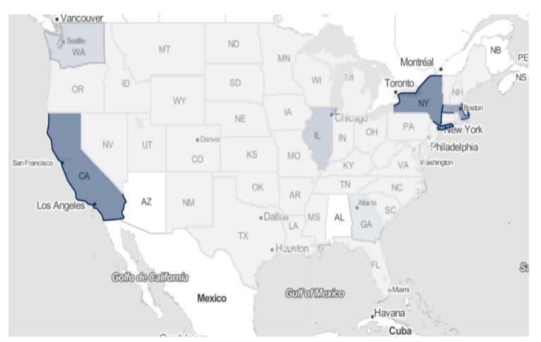 而美国的独角兽,主要集中在西海岸的加利福尼亚州(73家)和东部的纽约州(11家),其次是马萨诸塞州(8家)和伊利诺伊州(4家)。美国西海岸,特别是加利福尼亚州的旧金山湾区,依托硅谷高科技企业的发展,吸引了世界各国一流的科技创新人才在此集聚,共有38家独角兽企业,占整个加利福尼亚州的52%。周边大学和研究机构和政府组建的高新技术孵化器为独角兽的诞生提供了天然条件。同时,湾区对创新企业的政策支持、发达的风险投资、完善的产业布局也是旧金山湾区引领世界独角兽格局的重要原因。纽约作为美国乃至世界的顶尖城市和经济中心,在资本、技术方面的优势也非常显著。