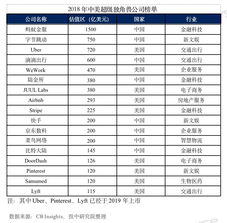 截至2018年末,美国估值超百亿美元的超级独角兽有9家,分别是交通出行公司Uber(720亿美元),联合办公租赁公司WeWork(470亿美元), 电子烟公司JUUL Labs(380亿美元), 民宿短租公司Airbnb(293亿美元), 网络支付公司Stripe(225亿美元), 外卖公司DoorDash(126亿美元),图片社交公司Pinterest(120亿美元),生物医药公司Samumed(120亿美元)和交通出行公司Lyft(115亿美元)。