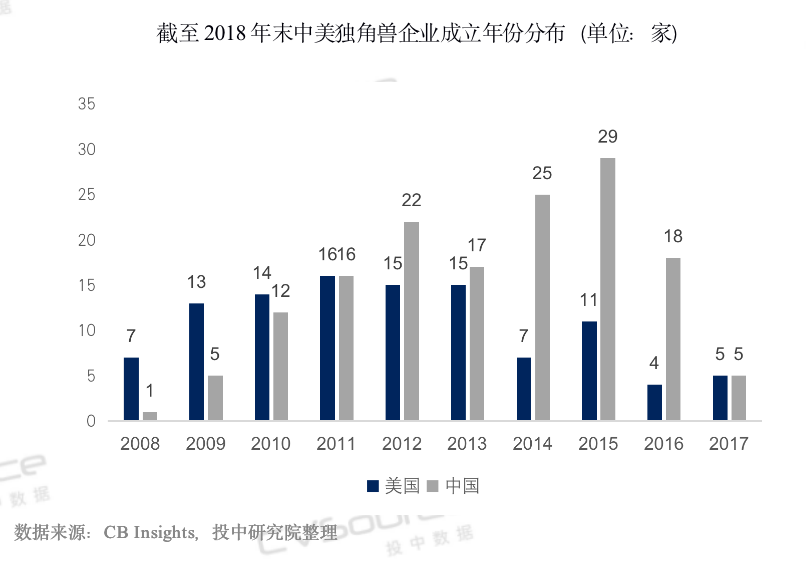 从图中可以看出,美国独角兽企业成立年份集中在2009-2013年,即成立时间在5-8年之间。而中国独角兽企业的成立年份最集中的是2012-2016年,即成立时间在2-6年之间。