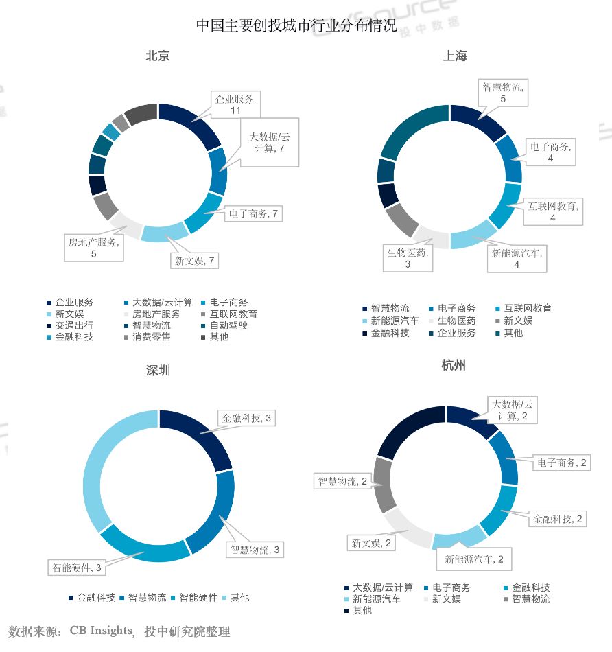 中国主要创投城市在行业分布上呈现不同的特点和侧重。北京的独角兽企业主要集中于企业服务、大数据/云计算、电子商务和新文娱。上海的独角兽企业侧重于在智慧物流、电子商务、互联网教育、新能源汽车等领域发力。深圳独角兽主要专注高新技术产业,聚焦的三大领域为金融科技、智慧物流和智能硬件。杭州独角兽的行业分布相对平均,分布于大数据/云计算、电子商务、金融科技、新能源汽车、新文娱、智慧物流等多个行业。