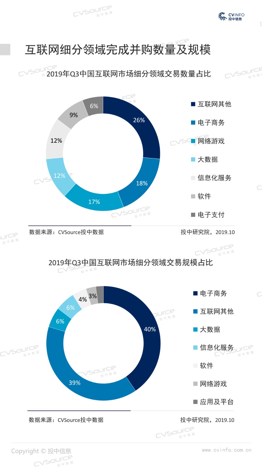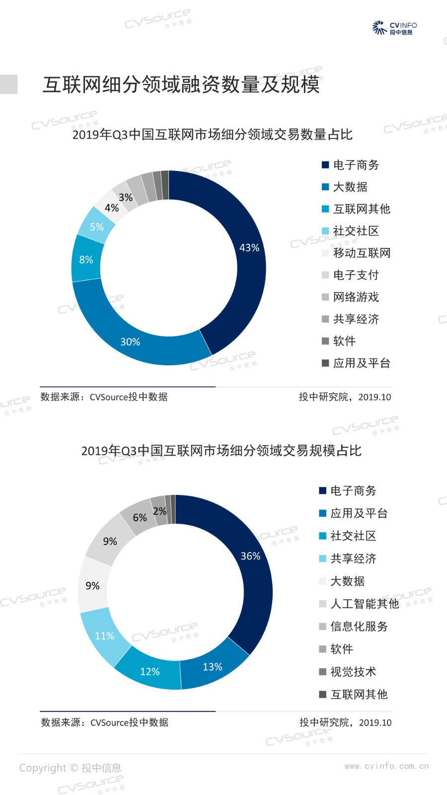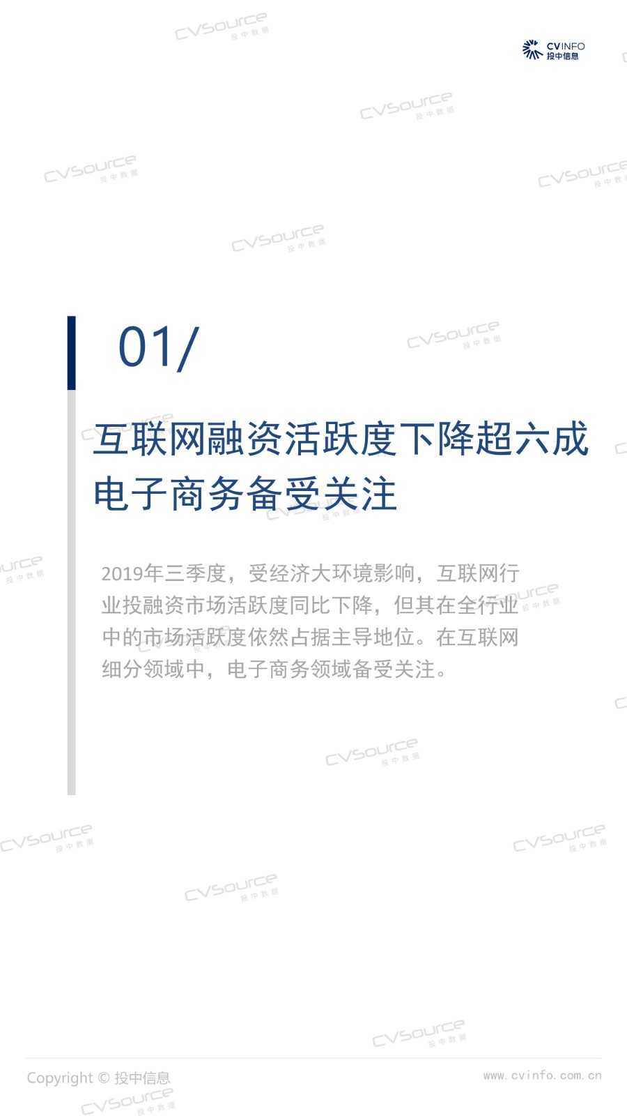 融资:2019年三季度,受经济大环境影响,互联网行业投融资市场活跃度同比下降,但其在全行业中的市场活跃度依然占据主导地位。在互联网细分领域中,电子商务领域备受关注。