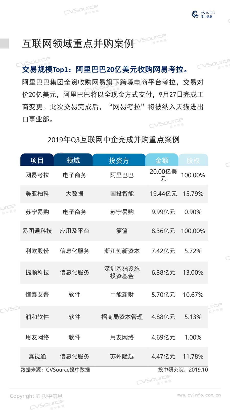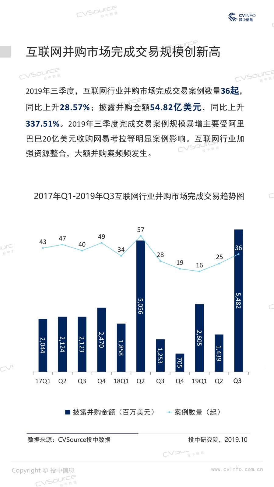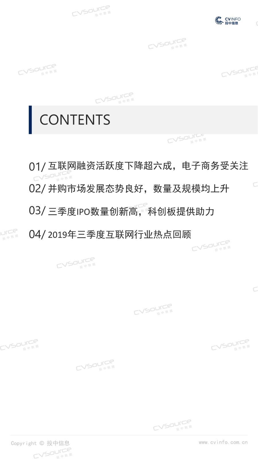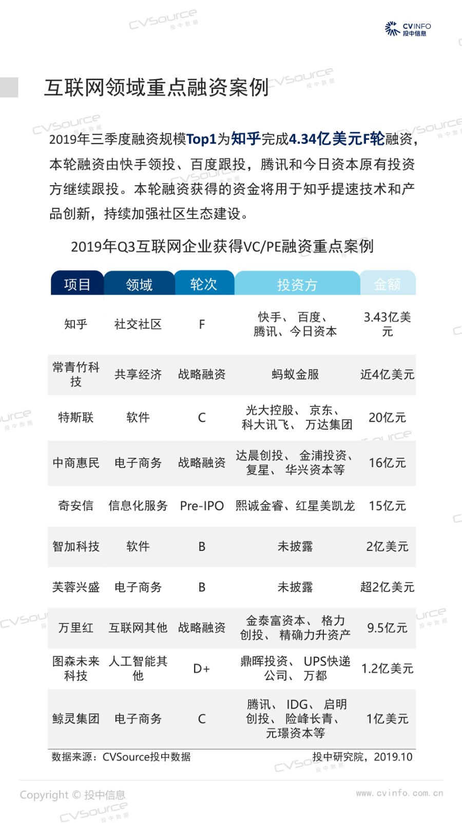 融资:2019年三季度,受经济大环境影响,互联网行业投融资市场活跃度同比下降,但其在全行业中的市场活跃度依然占据主导地位。在互联网细分领域中,电子商务领域备受关注。