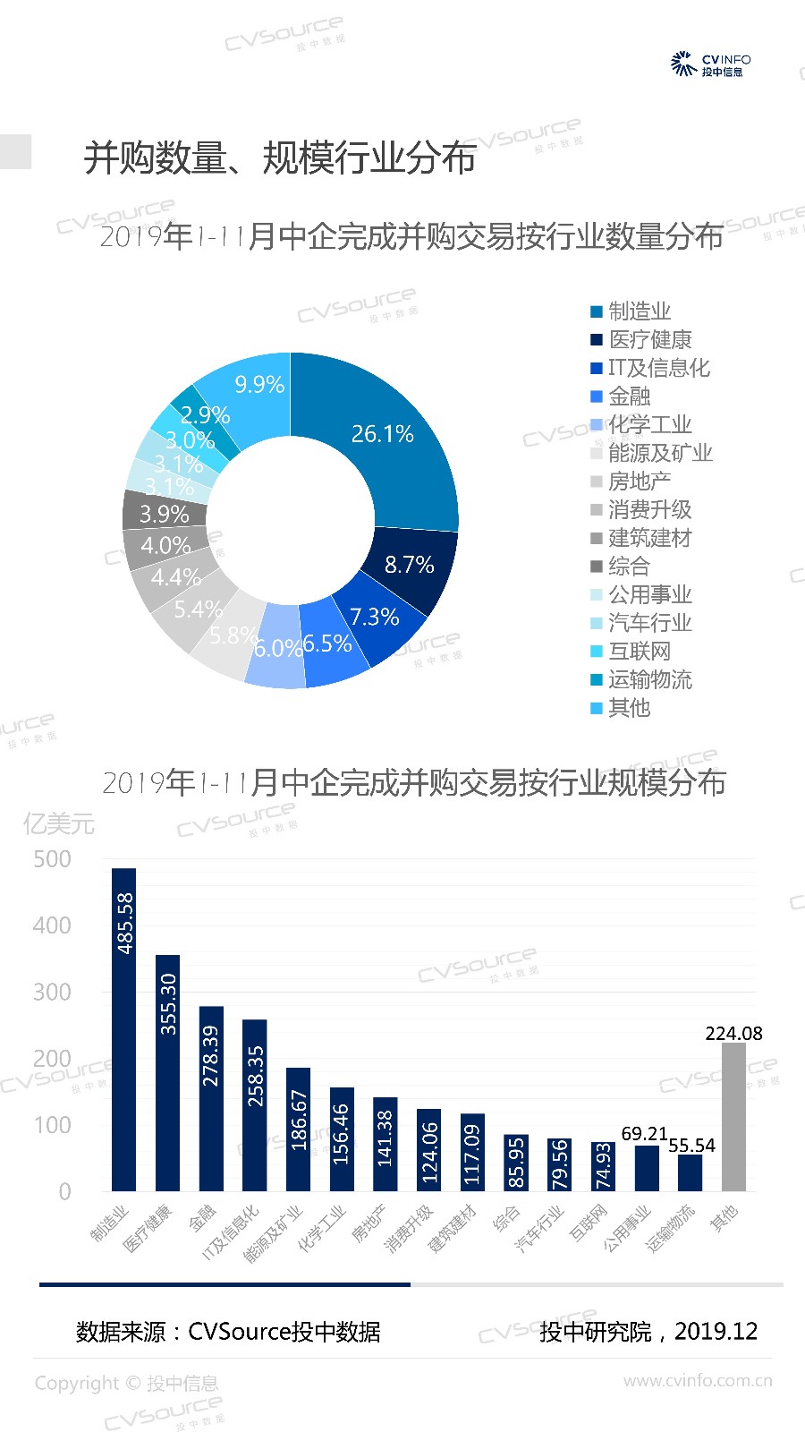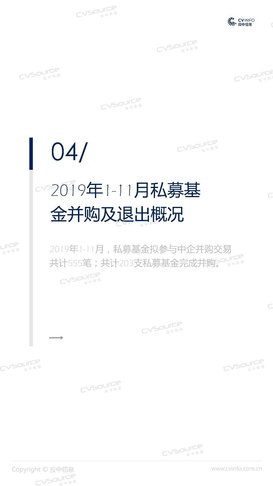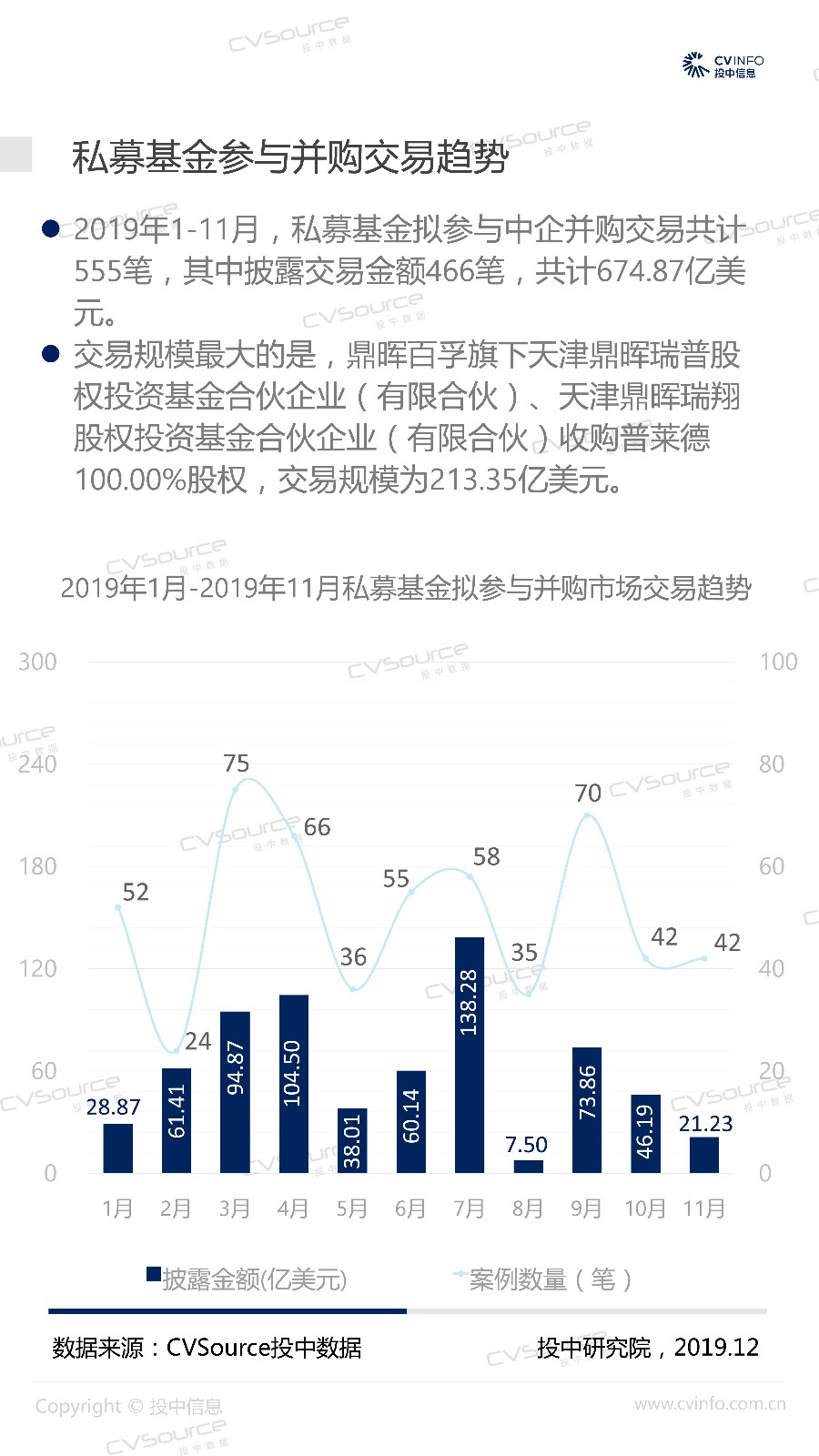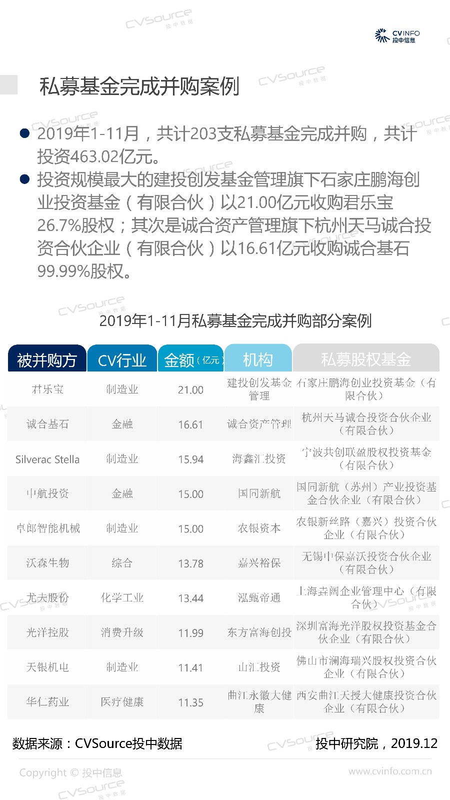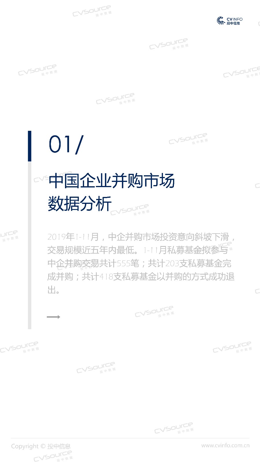 2019年1-11月,中企并购市场投资意向斜坡下滑,交易规模近五年内最低。1-11月私募基金拟参与中企并购交易共计555笔;共计203支私募基金完成并购;共计418支私募基金以并购的方式成功退出。