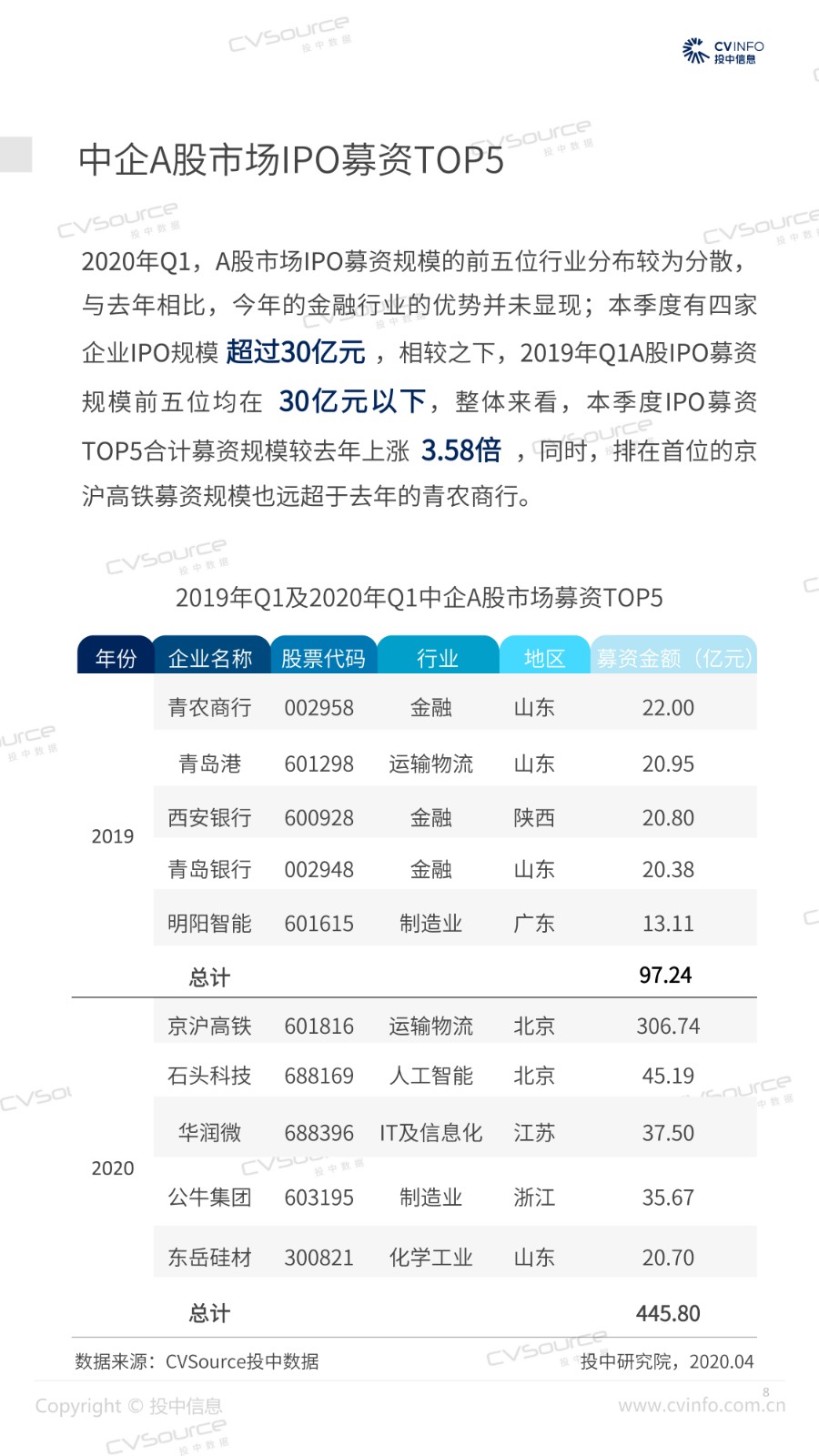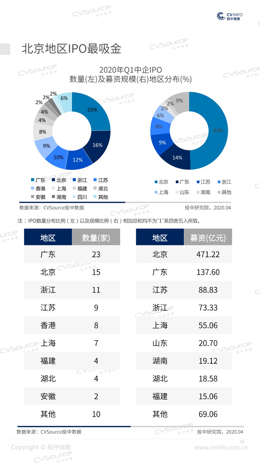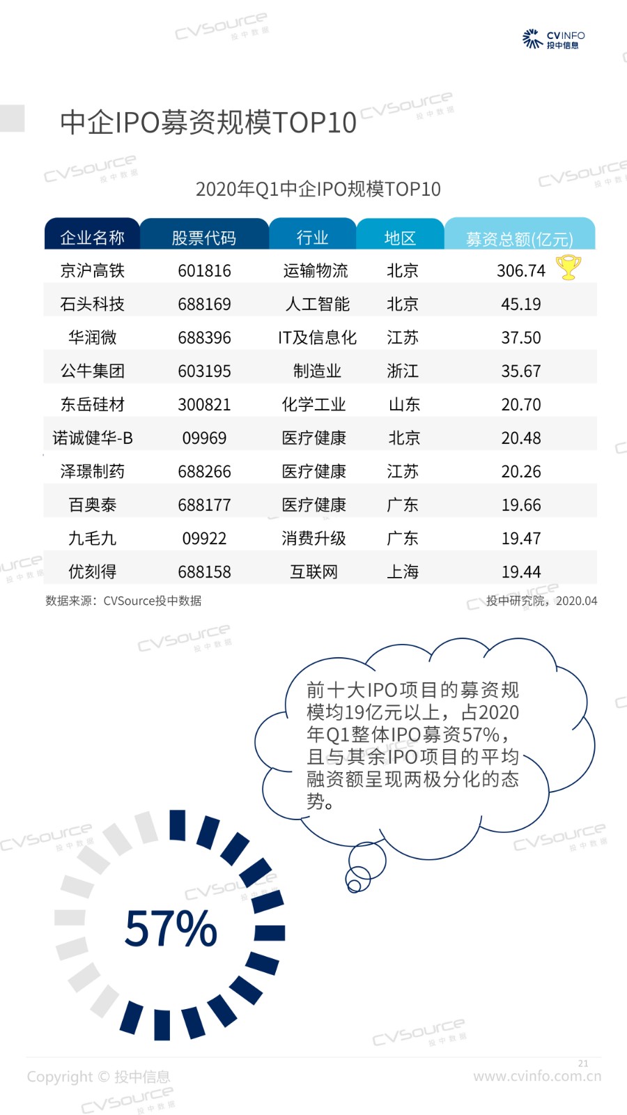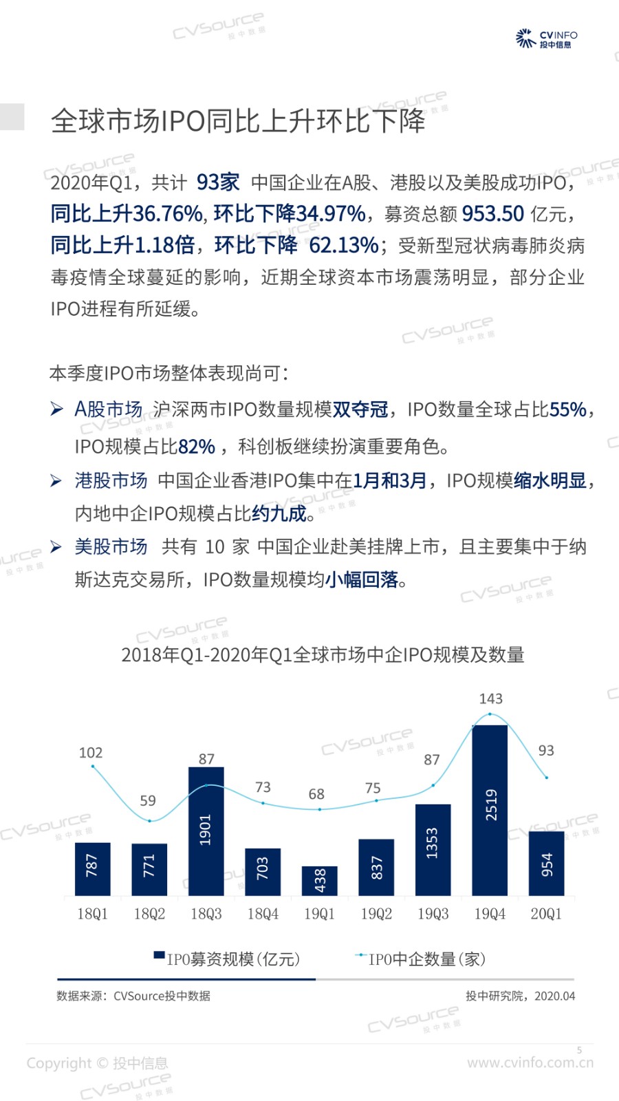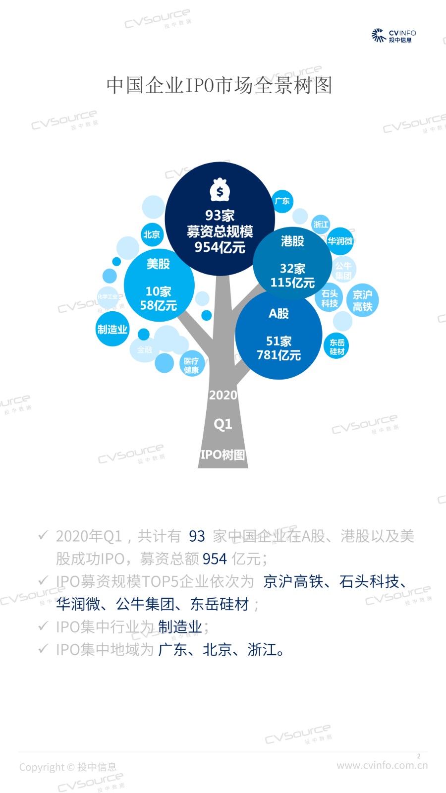 2020年Q1,共计有93家中国企业在A股、港股以及美股成功IPO,募资总额954亿元;IPO募资规模TOP5企业依次为京沪高铁、石头科技、华润微、公牛集团、东岳硅材;IPO集中行业为制造业;IPO集中地域为广东、北京、浙江。
