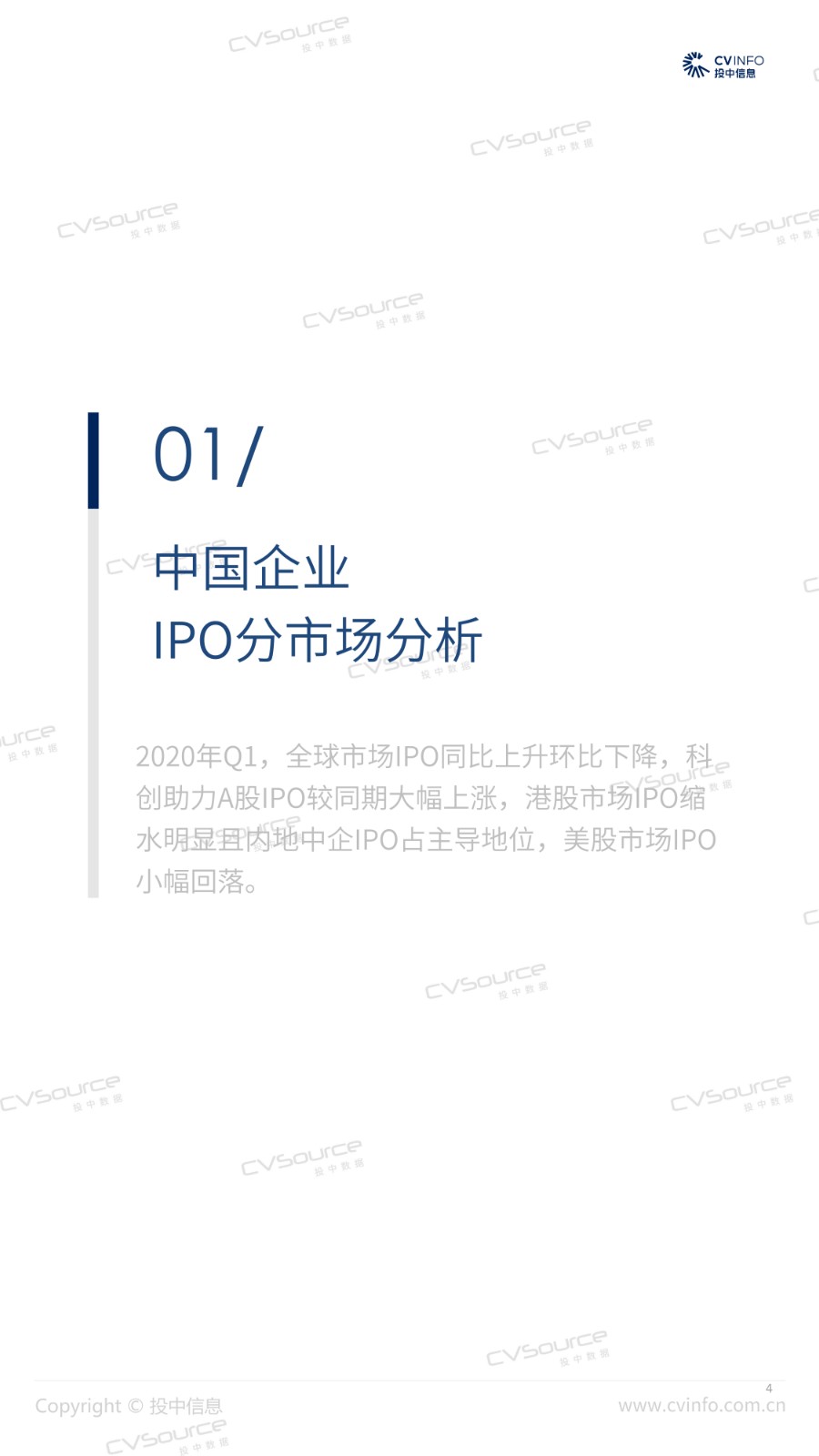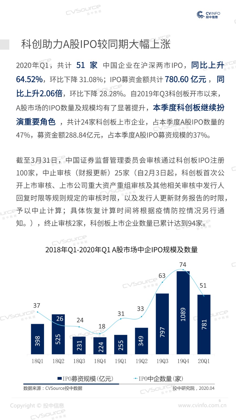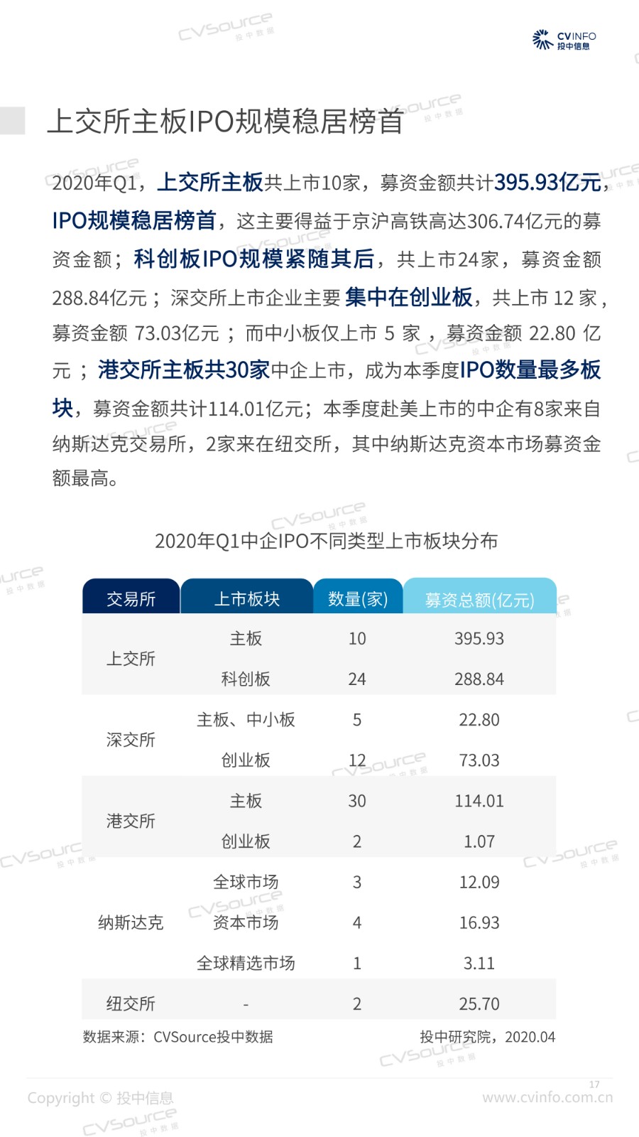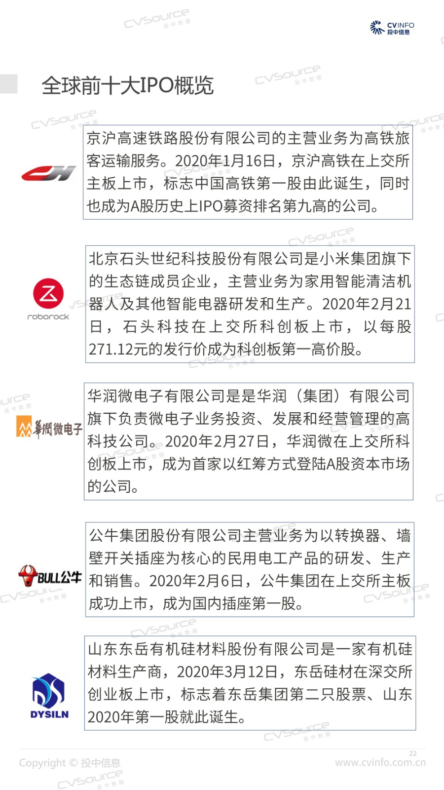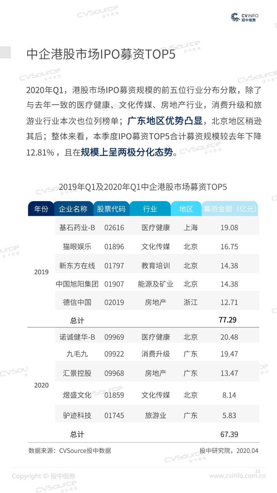 2020年Q1,共计有93家中国企业在A股、港股以及美股成功IPO,募资总额954亿元;IPO募资规模TOP5企业依次为京沪高铁、石头科技、华润微、公牛集团、东岳硅材;IPO集中行业为制造业;IPO集中地域为广东、北京、浙江。
