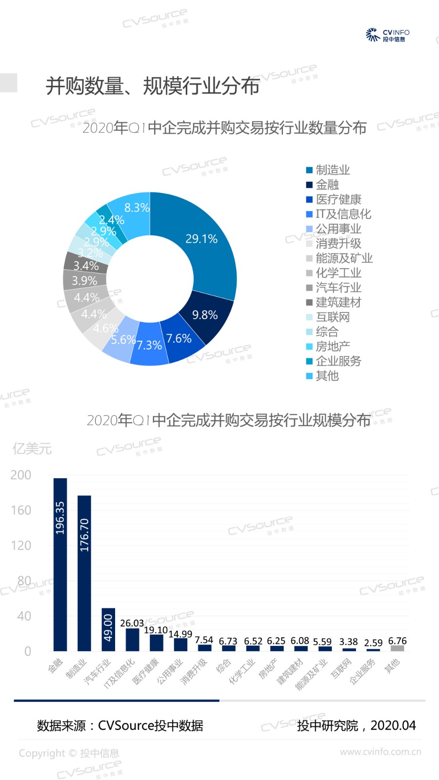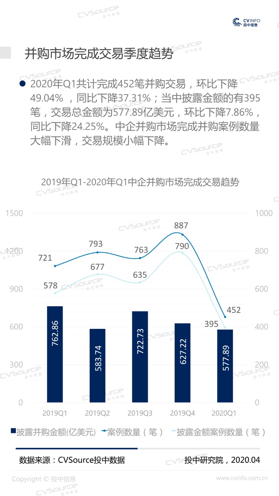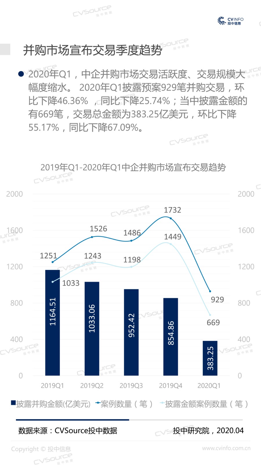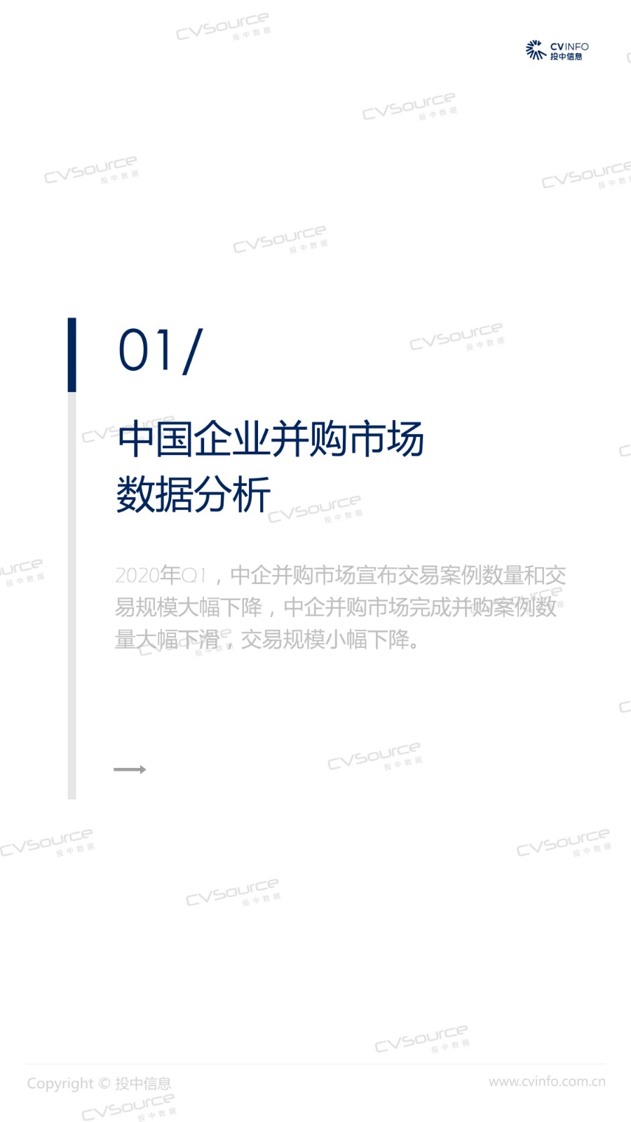 2020年Q1,中企并购市场宣布交易案例数量和交易规模大幅下降,中企并购市场完成并购案例数量大幅下滑,交易规模小幅下降。