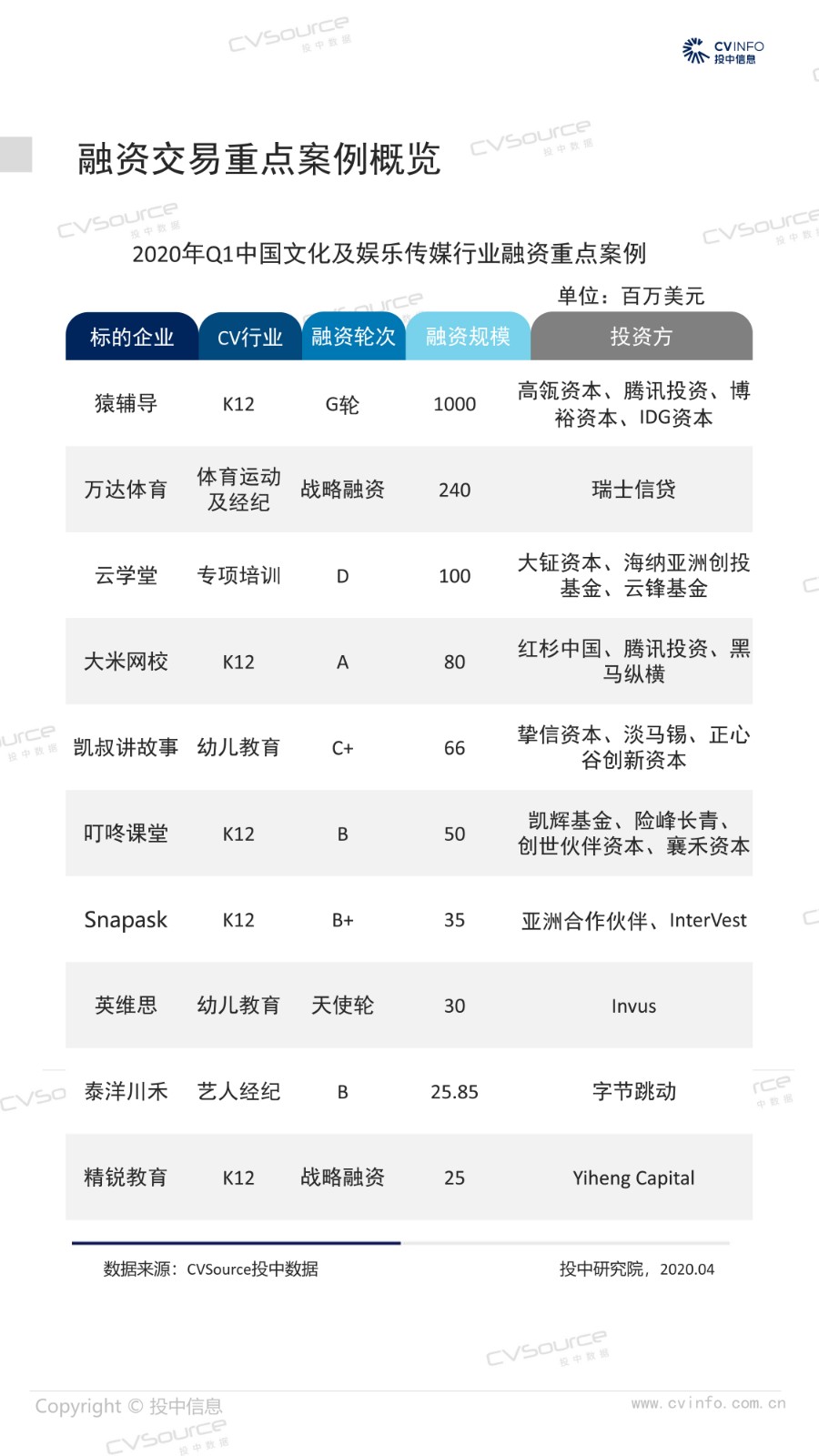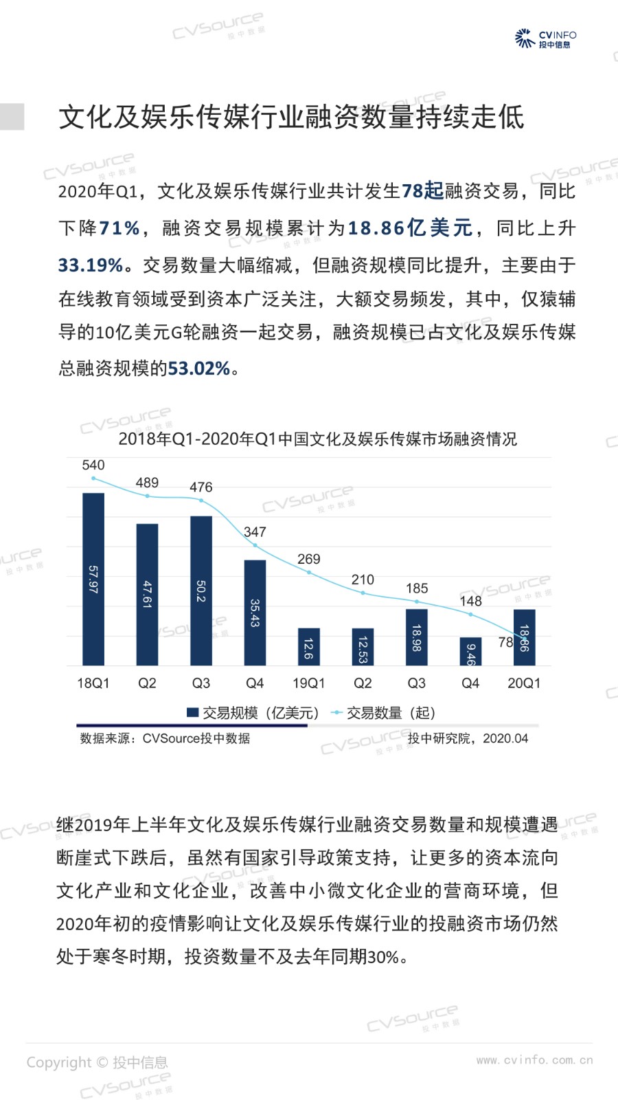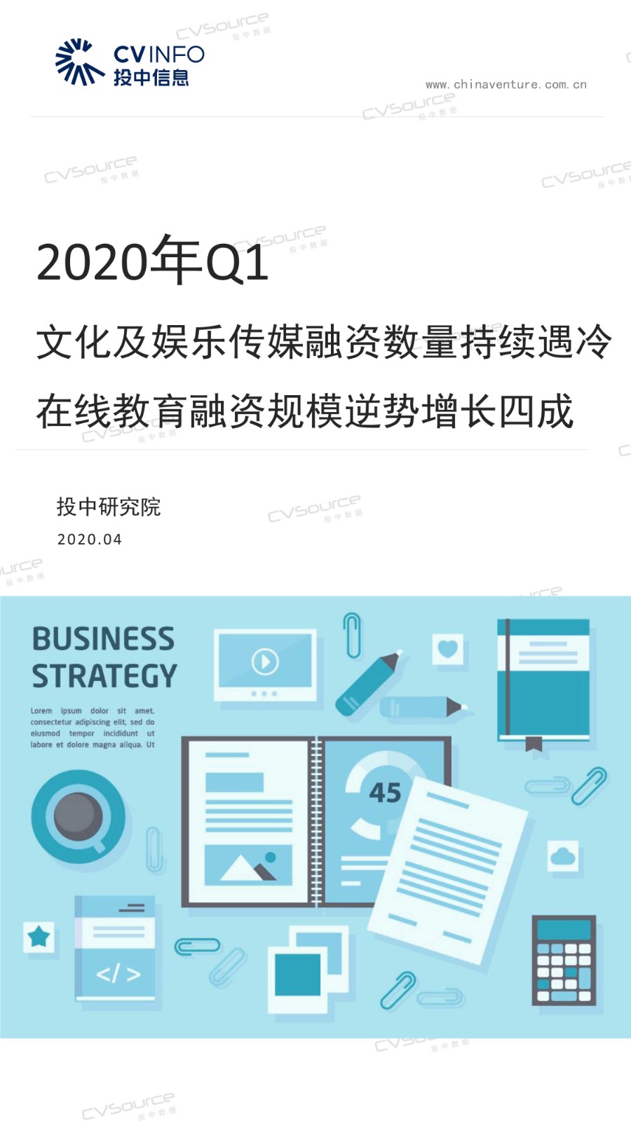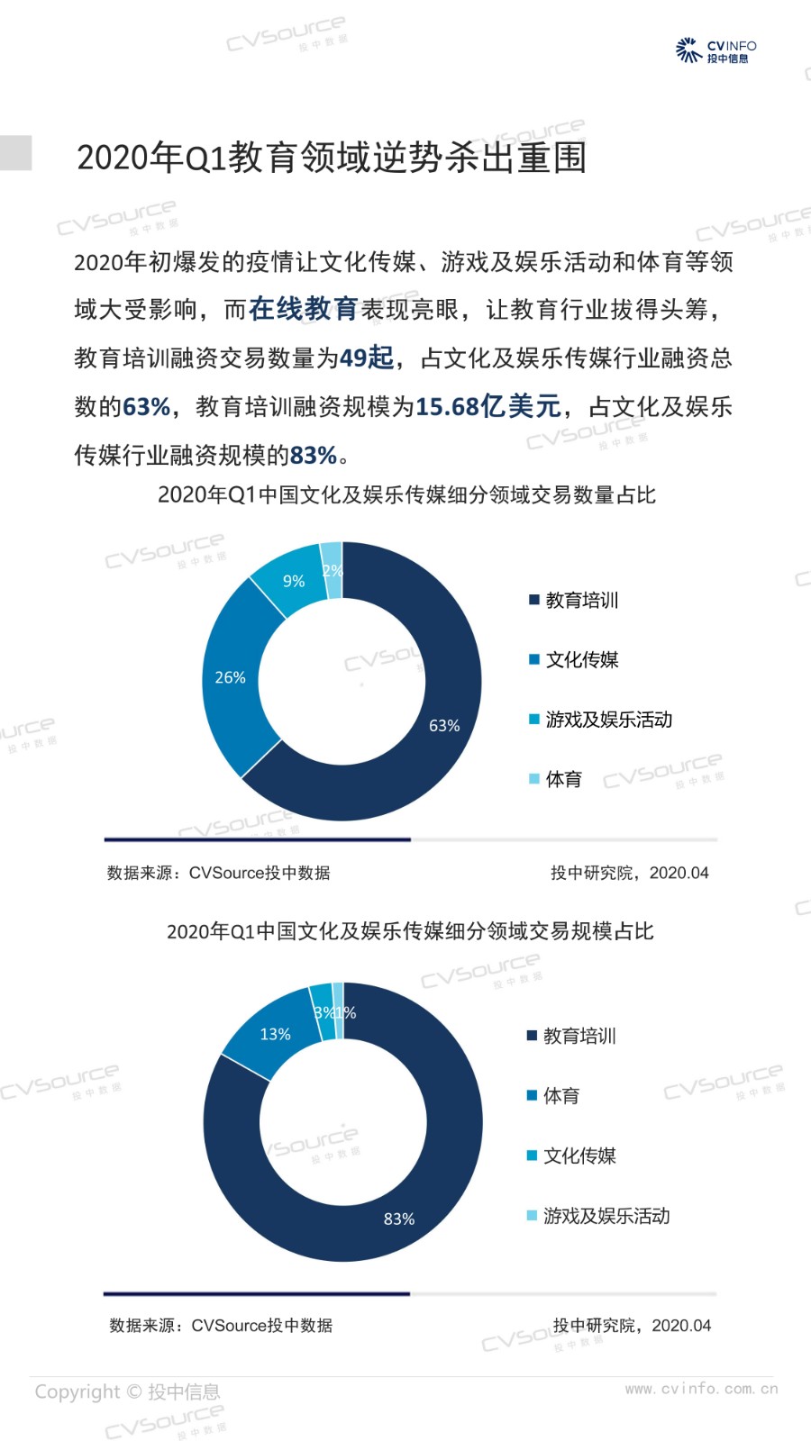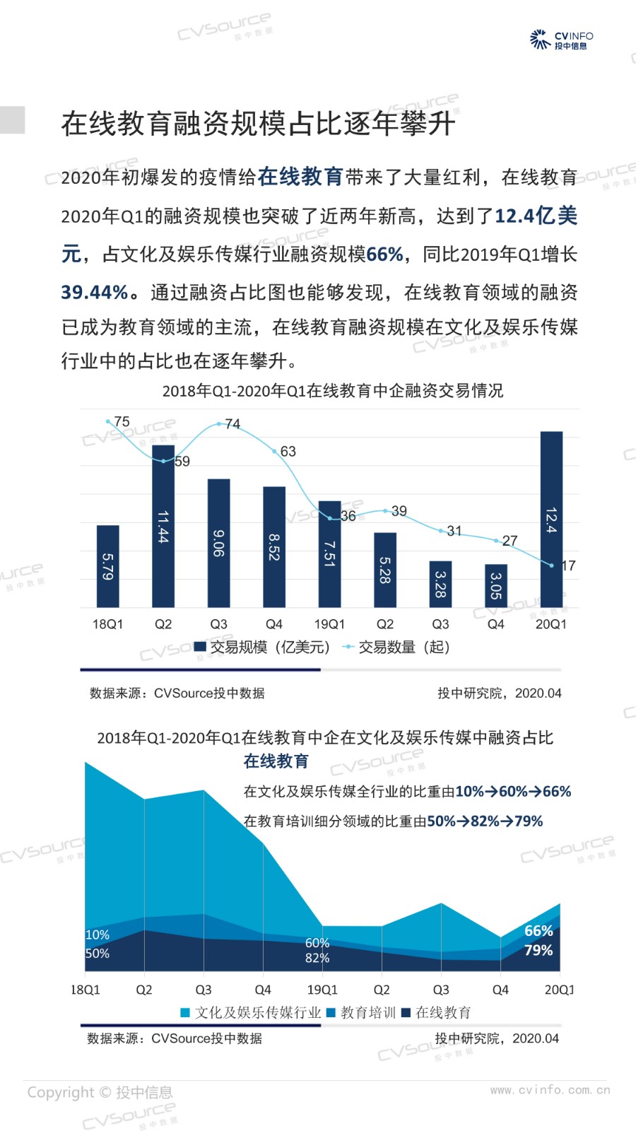 2020年Q1文化及娱乐传媒融资数量遇冷,在线教育融资规模逆势增长四成