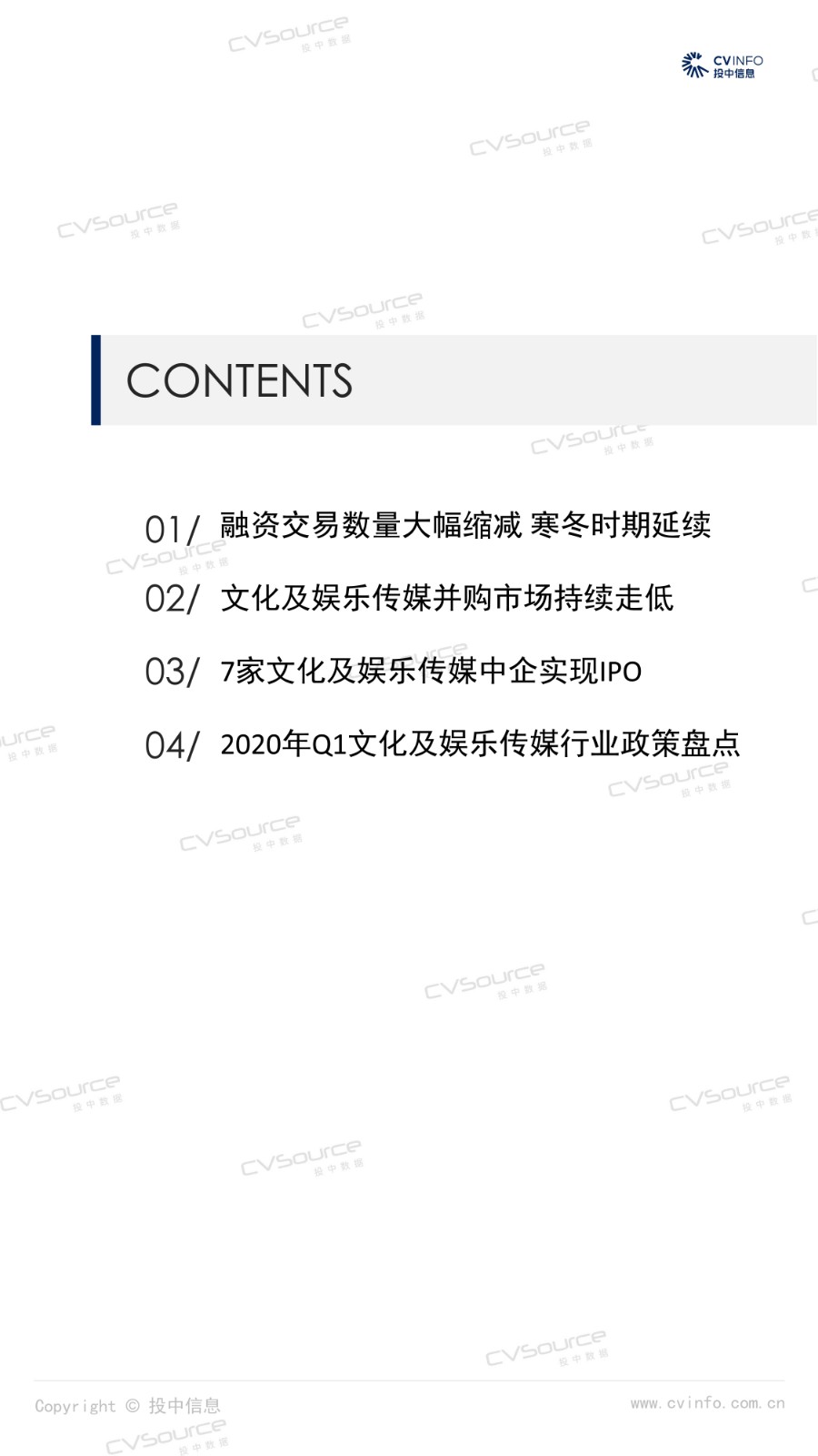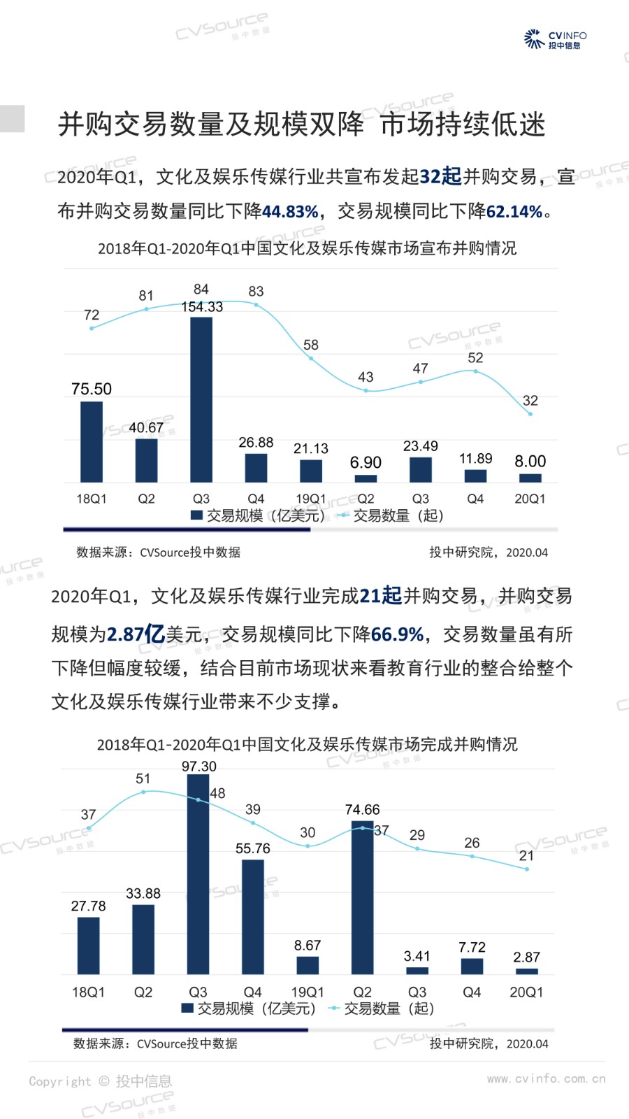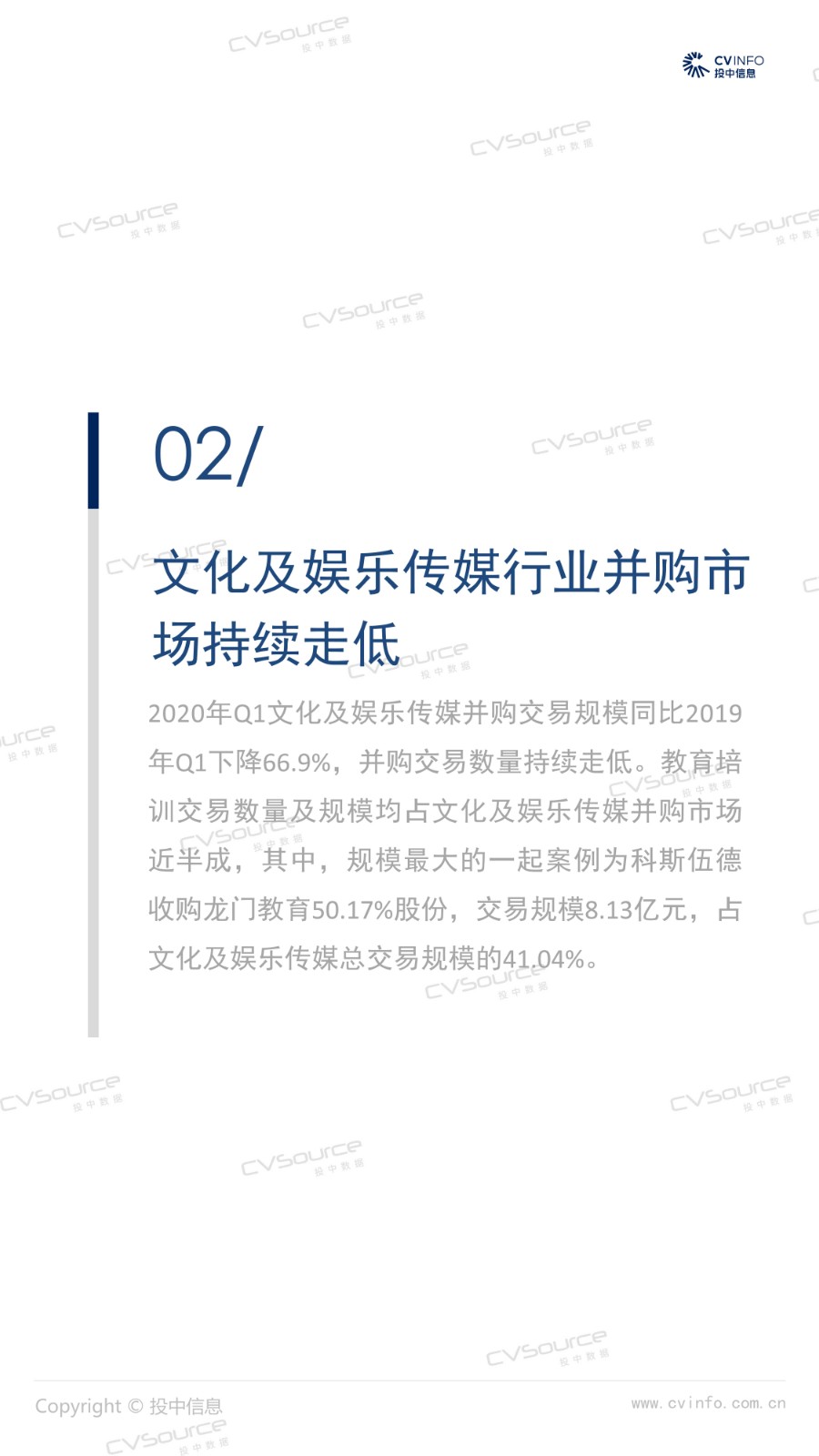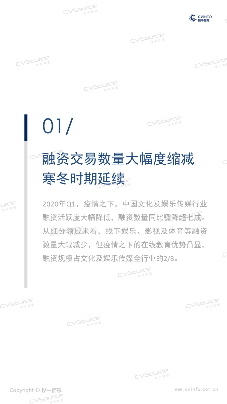 2020年Q1,融资交易数量大幅缩减,寒冬时期延续,文化及娱乐传媒并购市场持续走低。