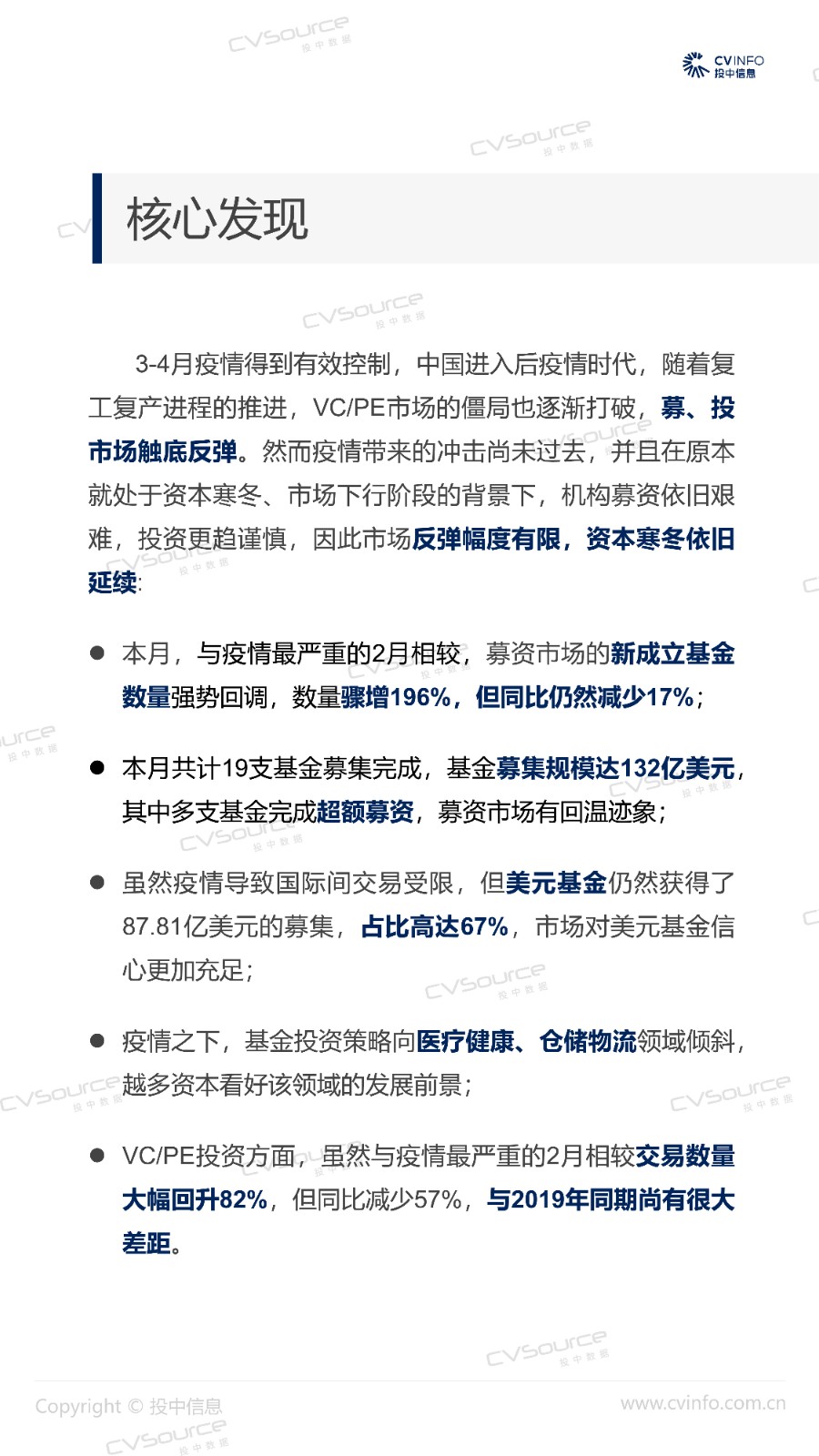中国进入后疫情时代,随着复工复产进程的推进,VC/PE市场的僵局也逐渐打破,募、投市场触底反弹。然而因为本就正处于资本寒冬、市场下行的大背景下,因此市场反弹幅度有限,资本寒冬依旧延续。