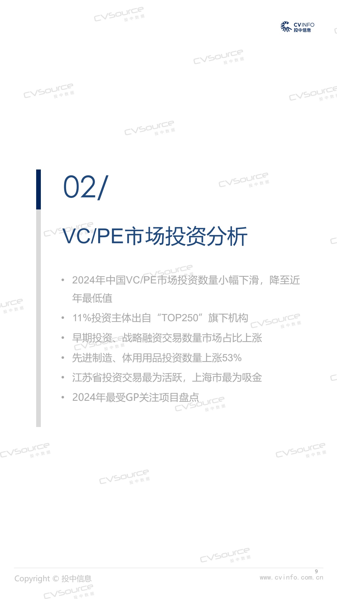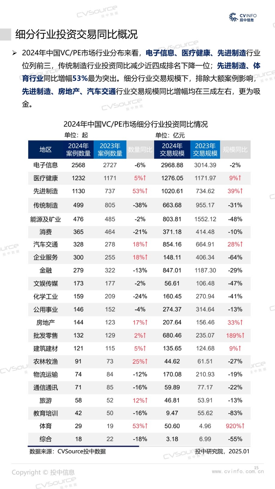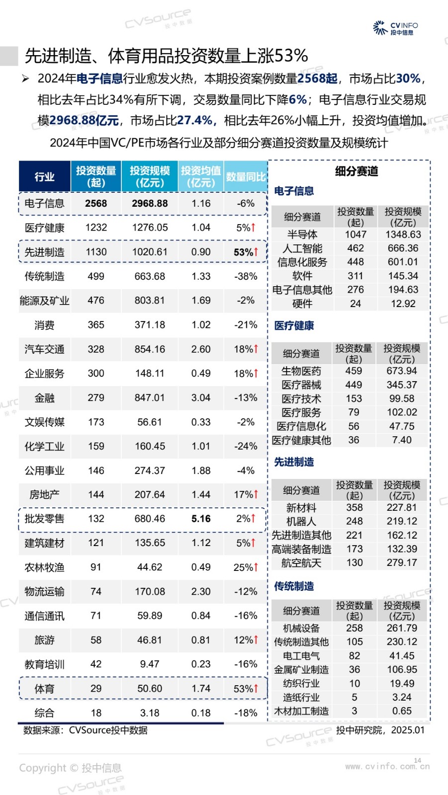 2024年新设基金数量规模同比减少41.9%,募资市场迎来腰斩;基金地区来看,浙江省基金数量最为突出,北京、武汉基金数量同比逆势增加。投资市场,投资数量规模均有小幅降温,头部机构出手规模大幅缩减;投资阶段来看,早期投资交易显著上涨,战略融资数量小幅回升;投资领域上,先进制造、体育用品投资数量上涨53%。