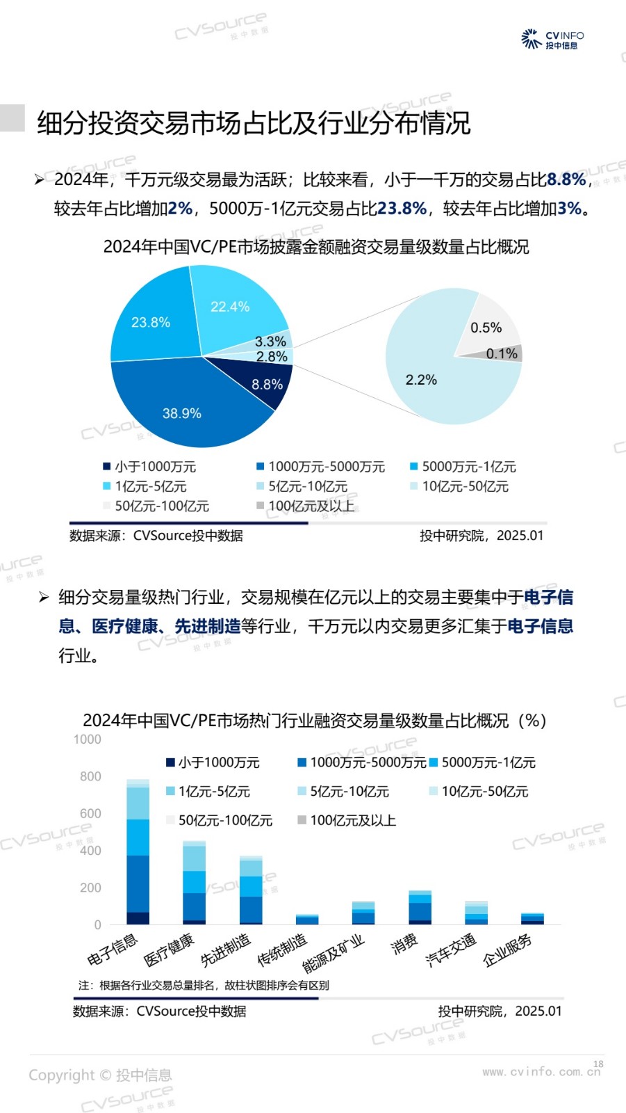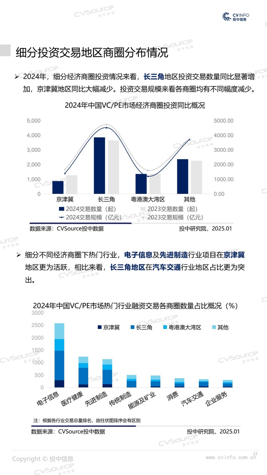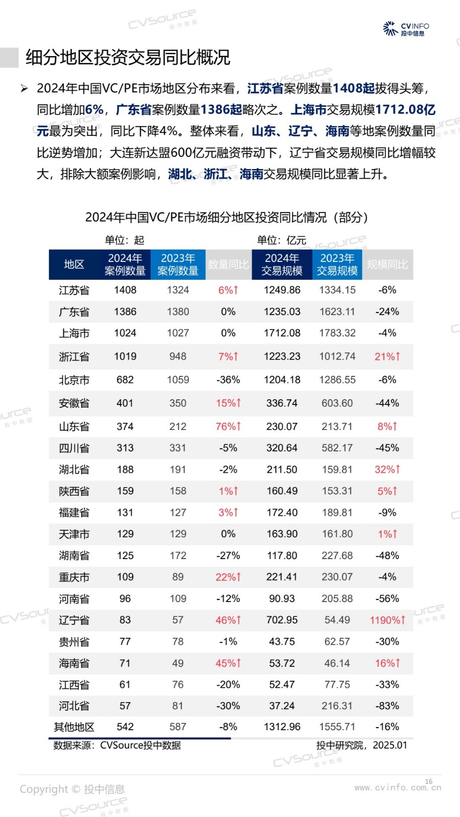 2024年新设基金数量规模同比减少41.9%,募资市场迎来腰斩;基金地区来看,浙江省基金数量最为突出,北京、武汉基金数量同比逆势增加。投资市场,投资数量规模均有小幅降温,头部机构出手规模大幅缩减;投资阶段来看,早期投资交易显著上涨,战略融资数量小幅回升;投资领域上,先进制造、体育用品投资数量上涨53%。