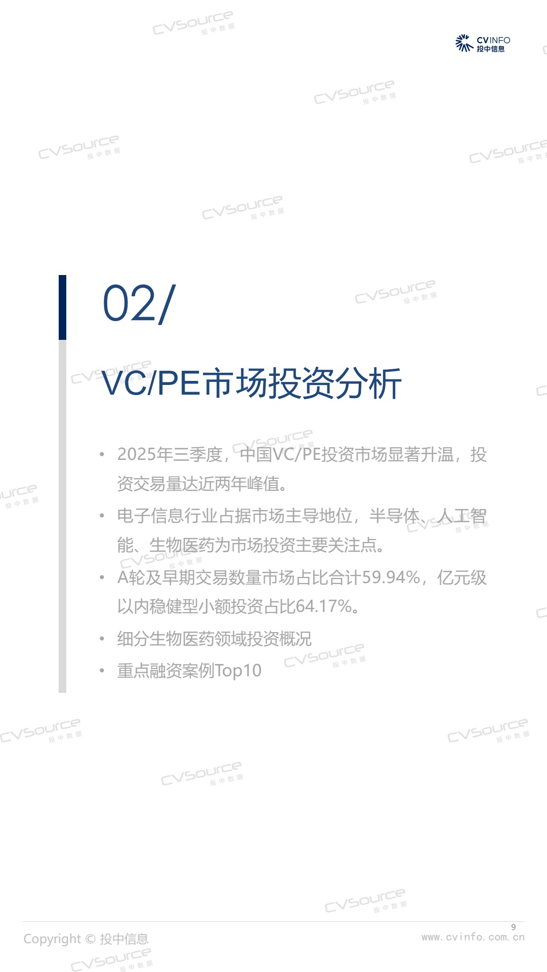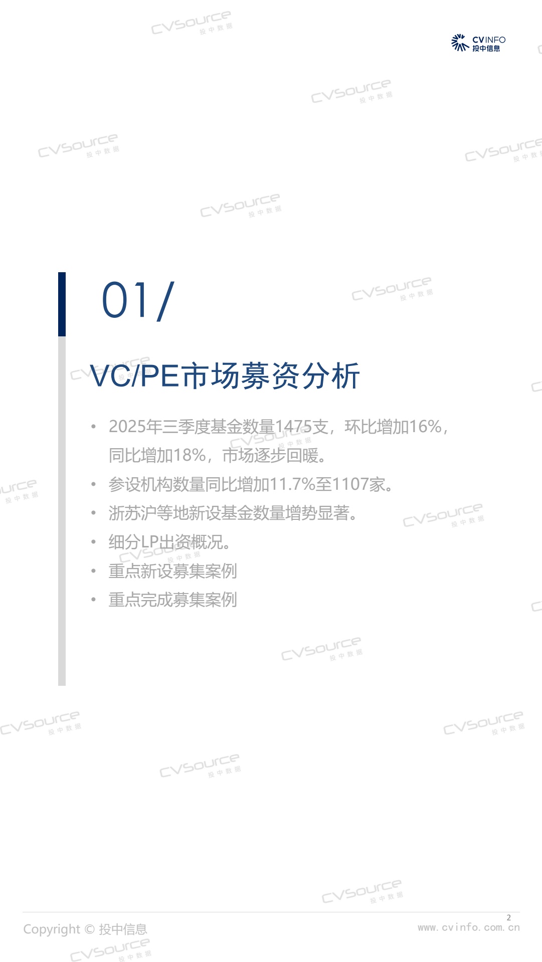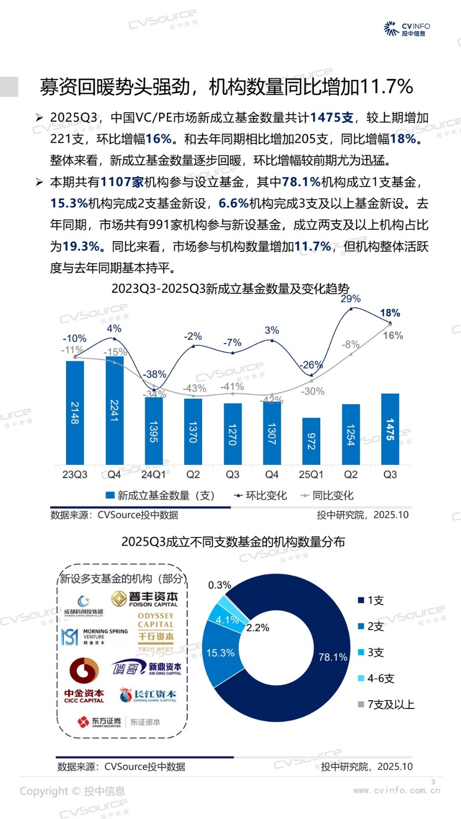 2025年三季度,募投市场强势回暖,基金数量环比增加16%,同比增加18%;募资市场参与机构同比增加11.7%至1107家,同时企业投资者LP大举入场,浙苏沪等地基金数量同比增势显著。投资市场,投资交易量达近两年峰值,市场显著升温,其中,A轮及早期交易数量市场占比合计59.94%,亿元级以内稳健型小额投资占比64.17%,生物医药投资活跃度激增。