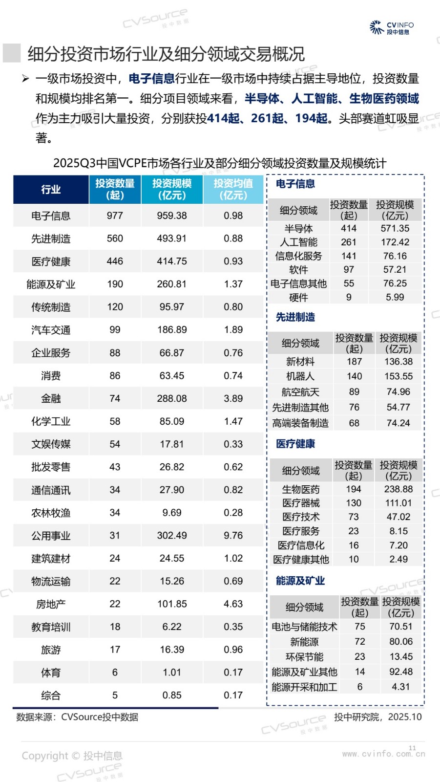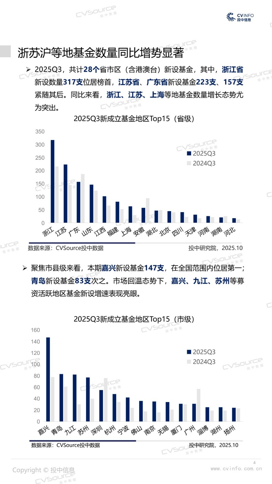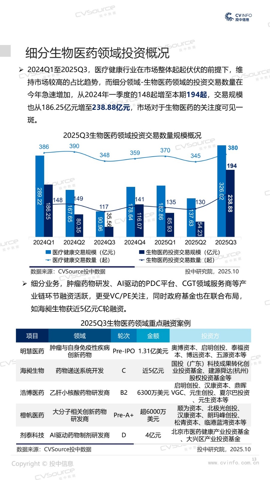 2025年三季度,募投市场强势回暖,基金数量环比增加16%,同比增加18%;募资市场参与机构同比增加11.7%至1107家,同时企业投资者LP大举入场,浙苏沪等地基金数量同比增势显著。投资市场,投资交易量达近两年峰值,市场显著升温,其中,A轮及早期交易数量市场占比合计59.94%,亿元级以内稳健型小额投资占比64.17%,生物医药投资活跃度激增。