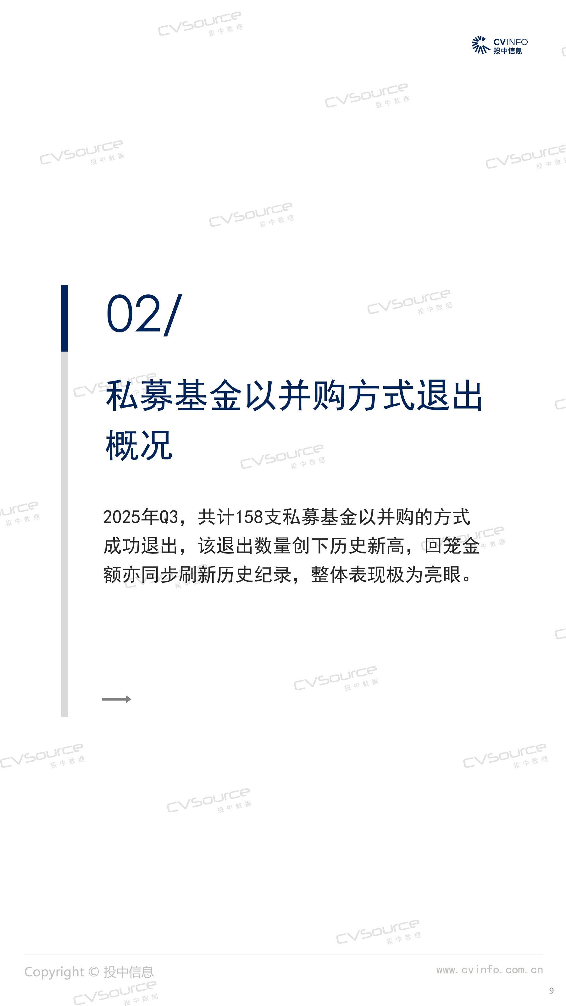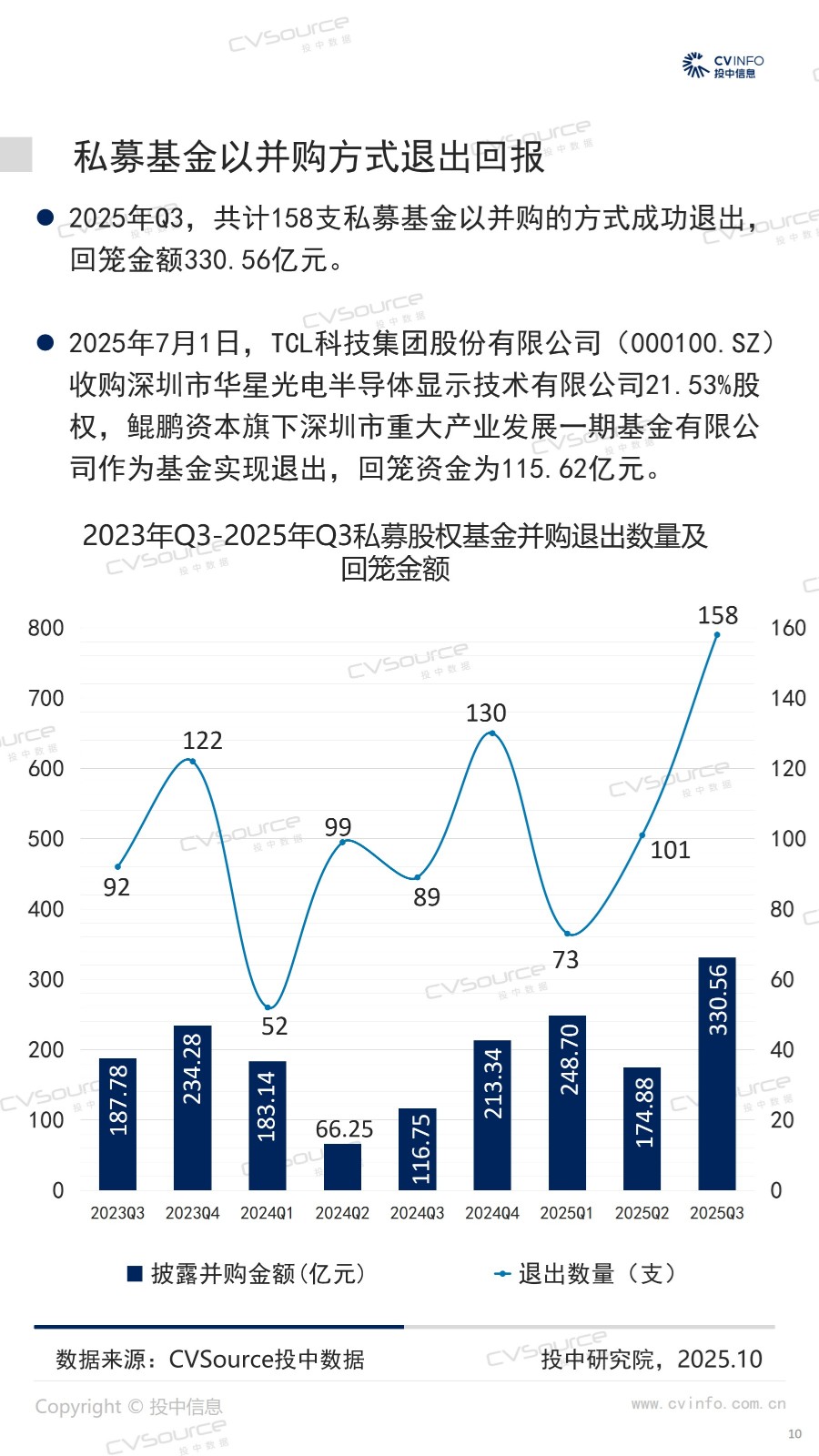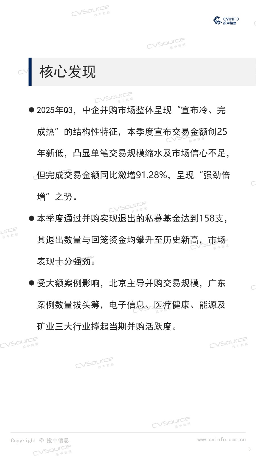 2025年Q3,中企并购市场整体呈现“宣布冷、完成热”的结构性特征,本季度宣布交易金额创25年新低,凸显单笔交易规模缩水及市场信心不足,但完成交易金额同比激增91.28%,呈现“强劲倍增”之势。 本季度通过并购实现退出的私募基金达到158支,其退出数量与回笼资金均攀升至历史新高,市场表现十分强劲。