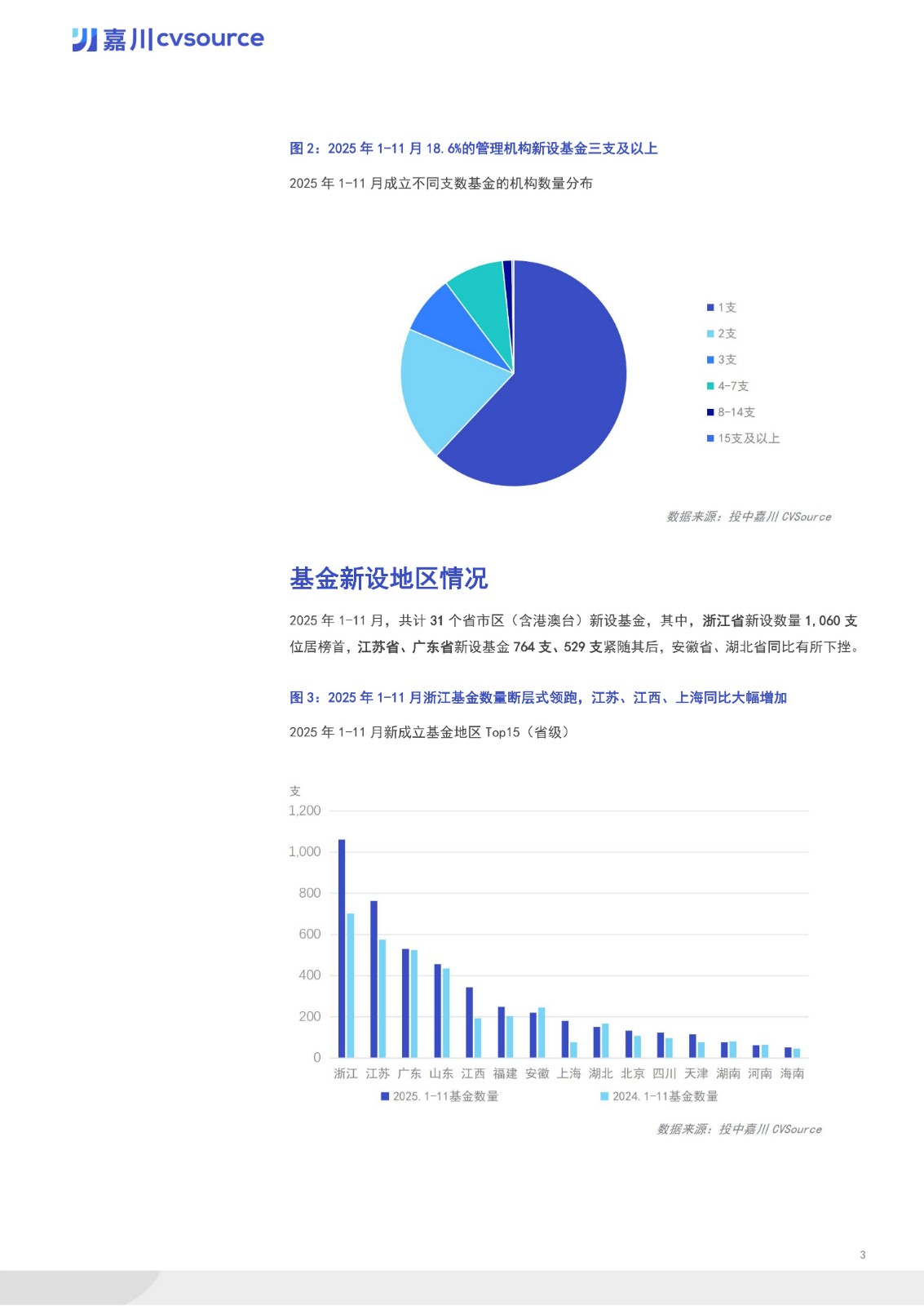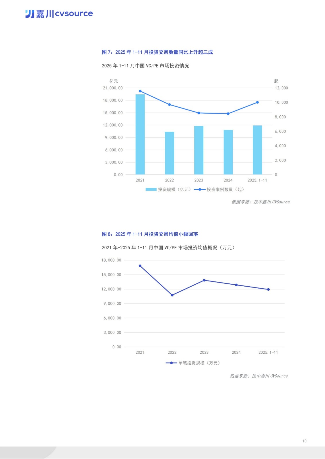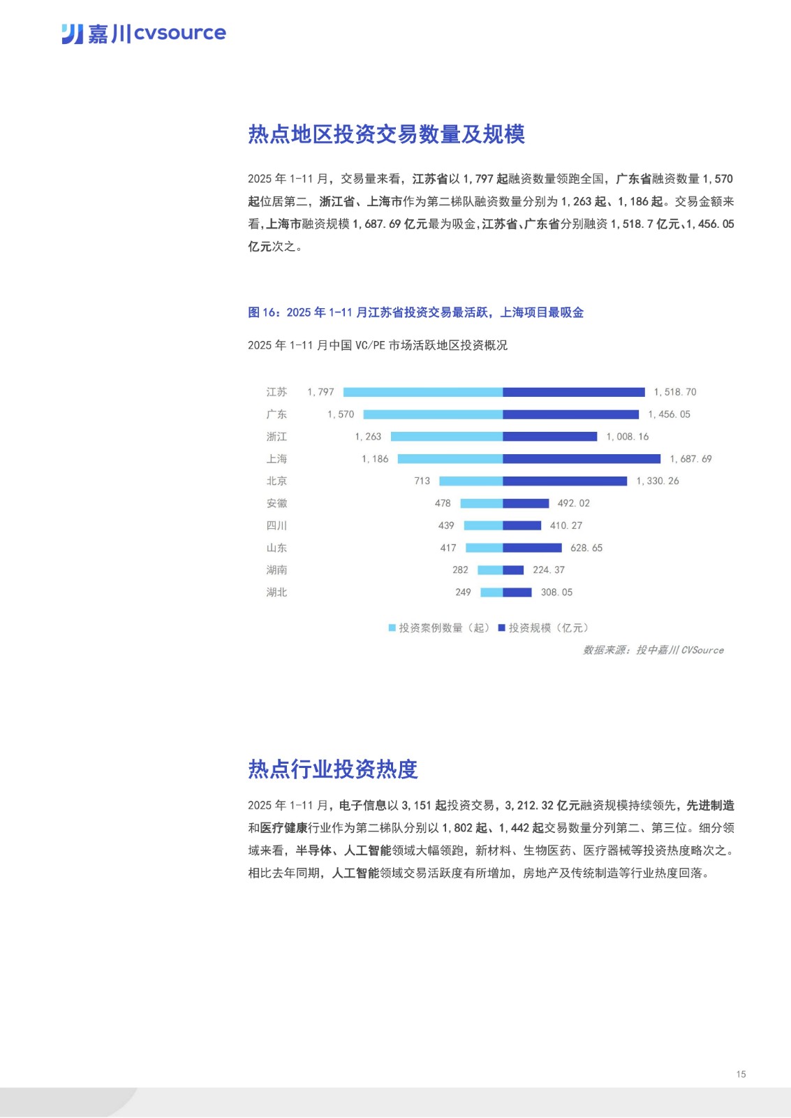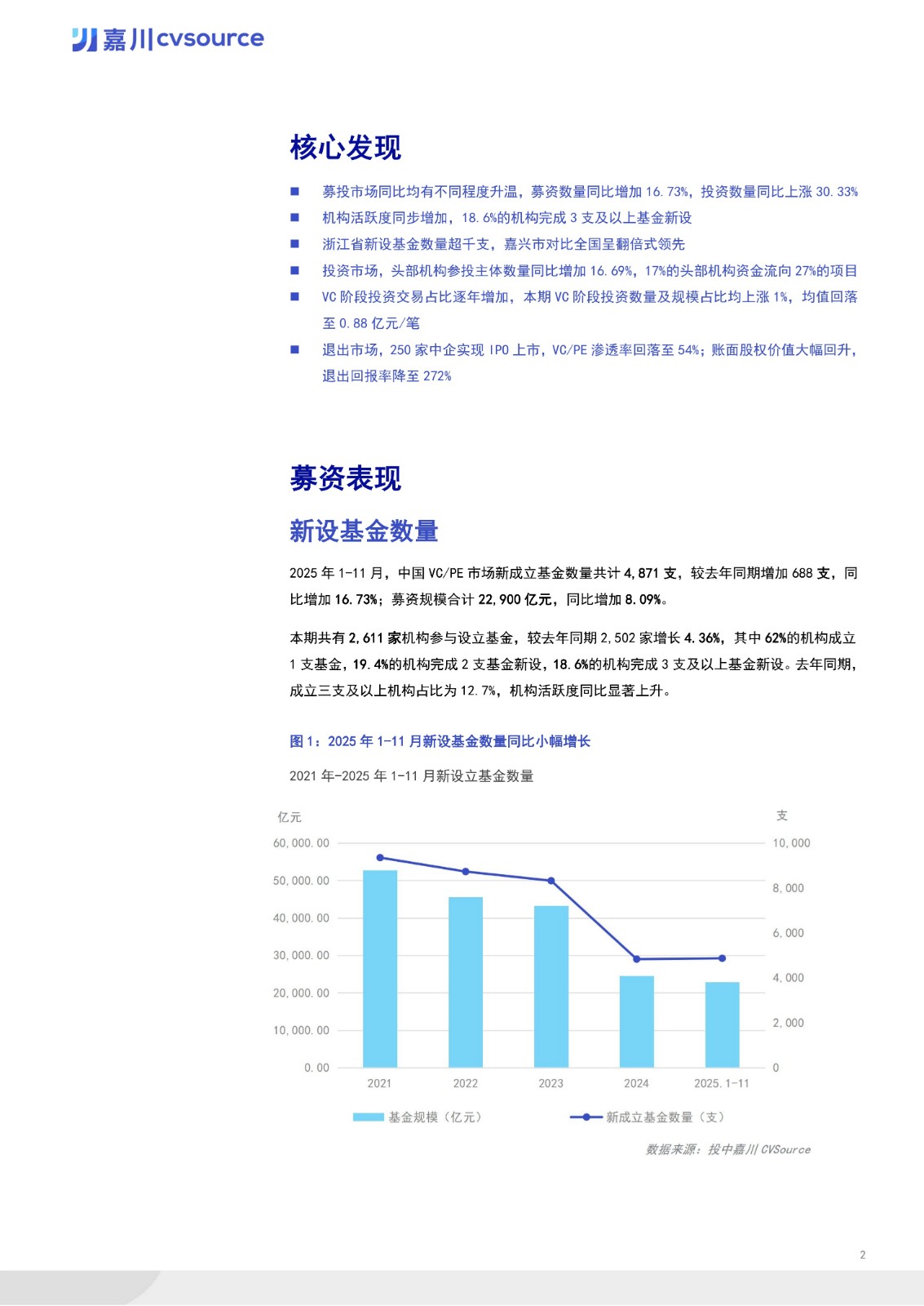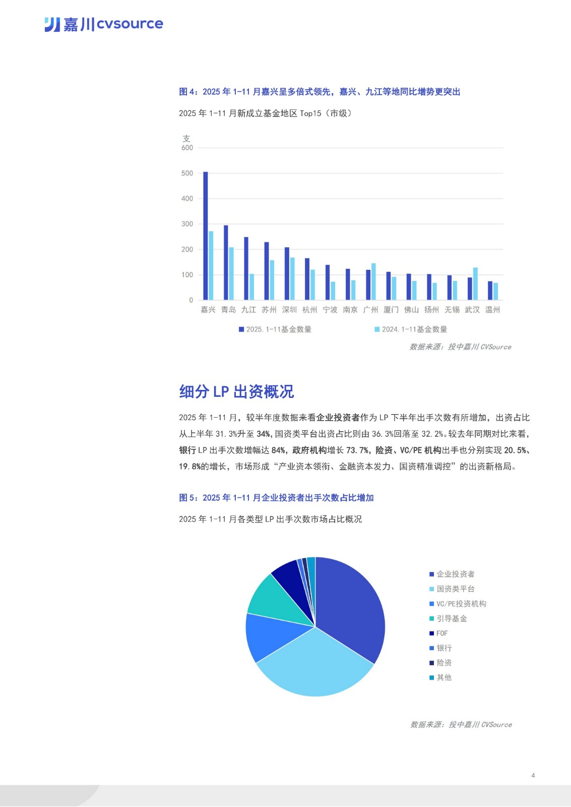 2025年1-11月,募投市场同比均有不同程度升温,募资数量同比增加16.73%,投资数量同比上涨30.33%。募资方面,机构活跃度同步增加,18.6%的机构完成3支及以上基金新设;浙江省新设基金数量超千支,嘉兴市对比全国呈翻倍式领先。投资市场,头部机构参投主体数量同比增加16.69%,17%的头部机构资金流向27%的项目。