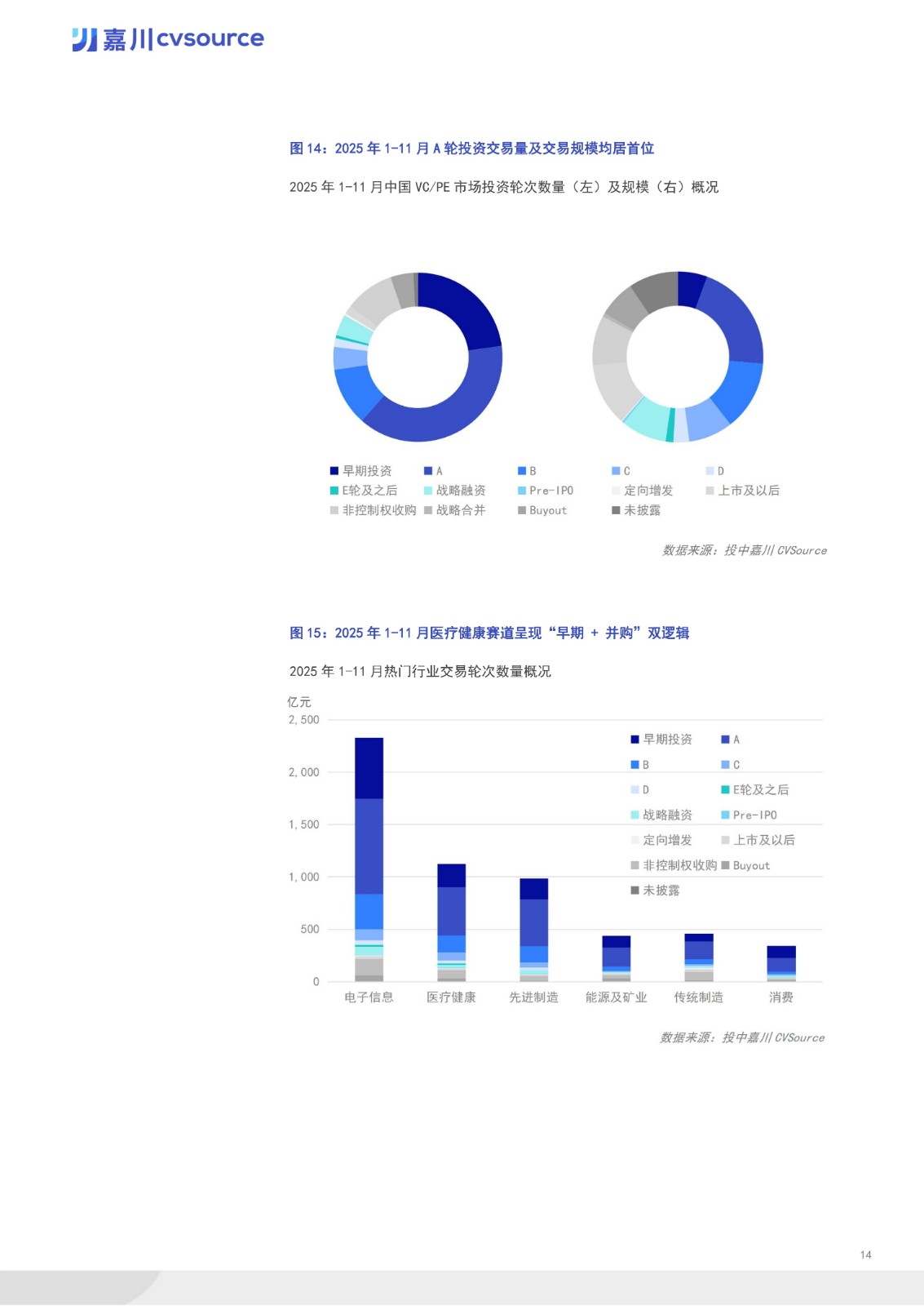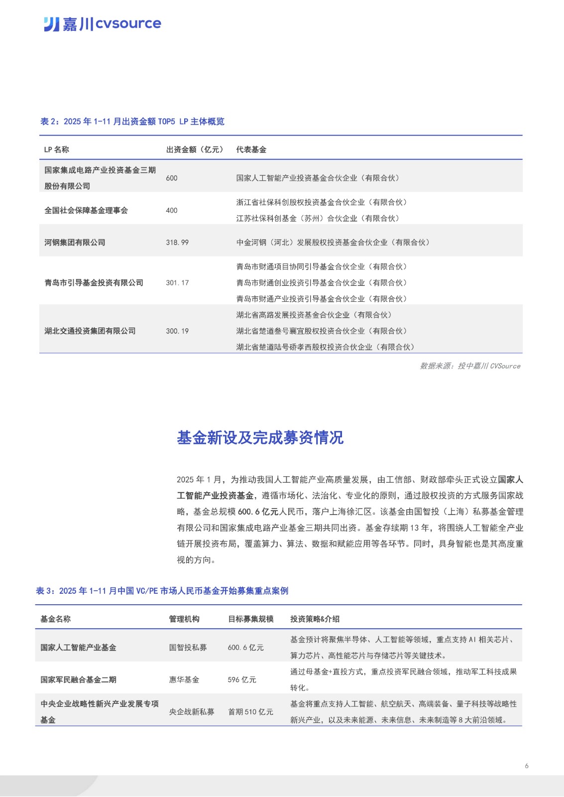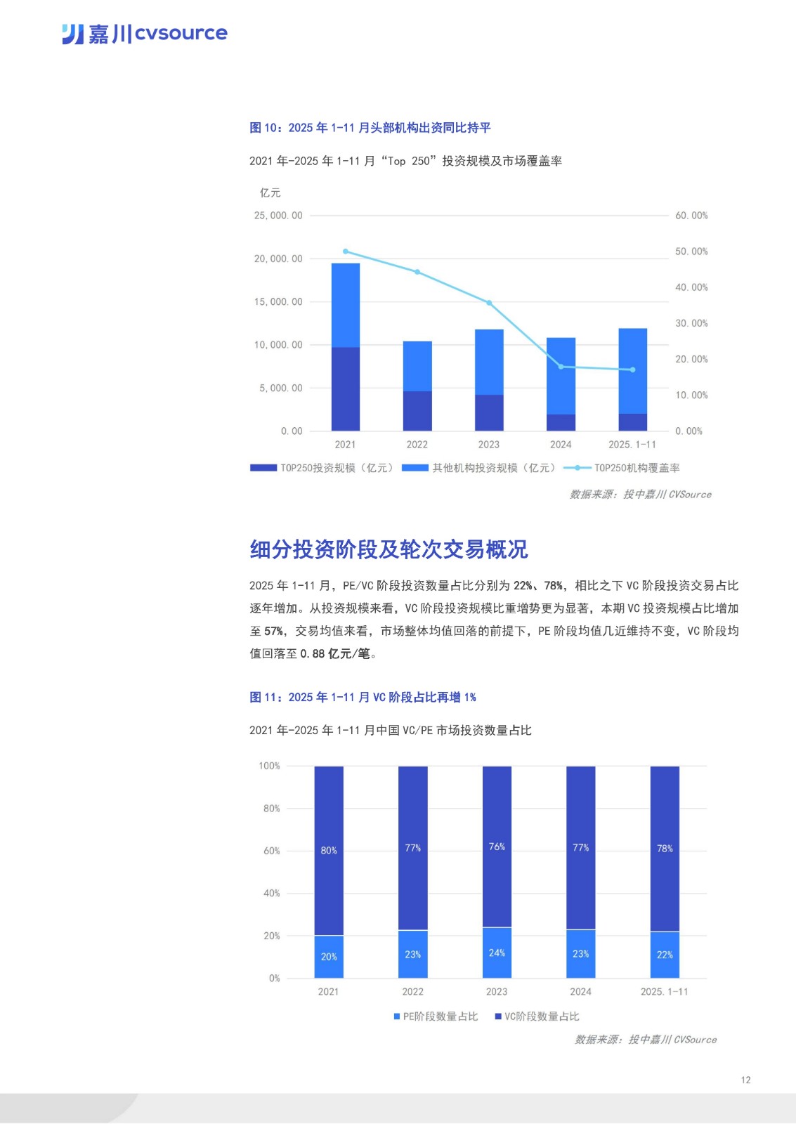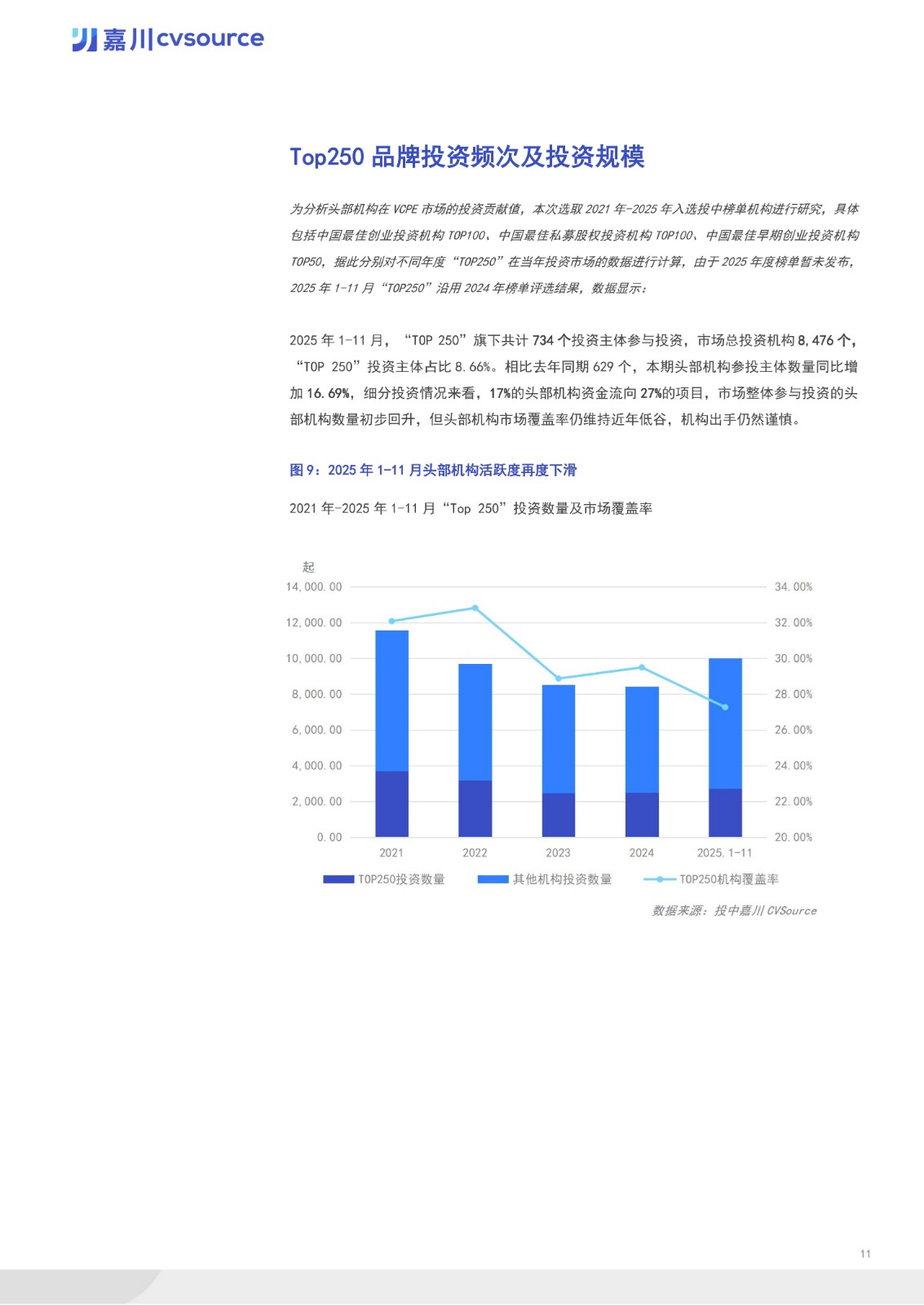 2025年1-11月,募投市场同比均有不同程度升温,募资数量同比增加16.73%,投资数量同比上涨30.33%。募资方面,机构活跃度同步增加,18.6%的机构完成3支及以上基金新设;浙江省新设基金数量超千支,嘉兴市对比全国呈翻倍式领先。投资市场,头部机构参投主体数量同比增加16.69%,17%的头部机构资金流向27%的项目。