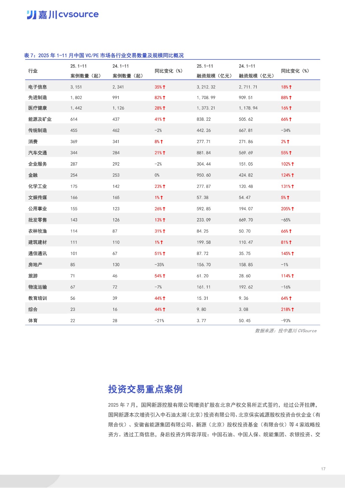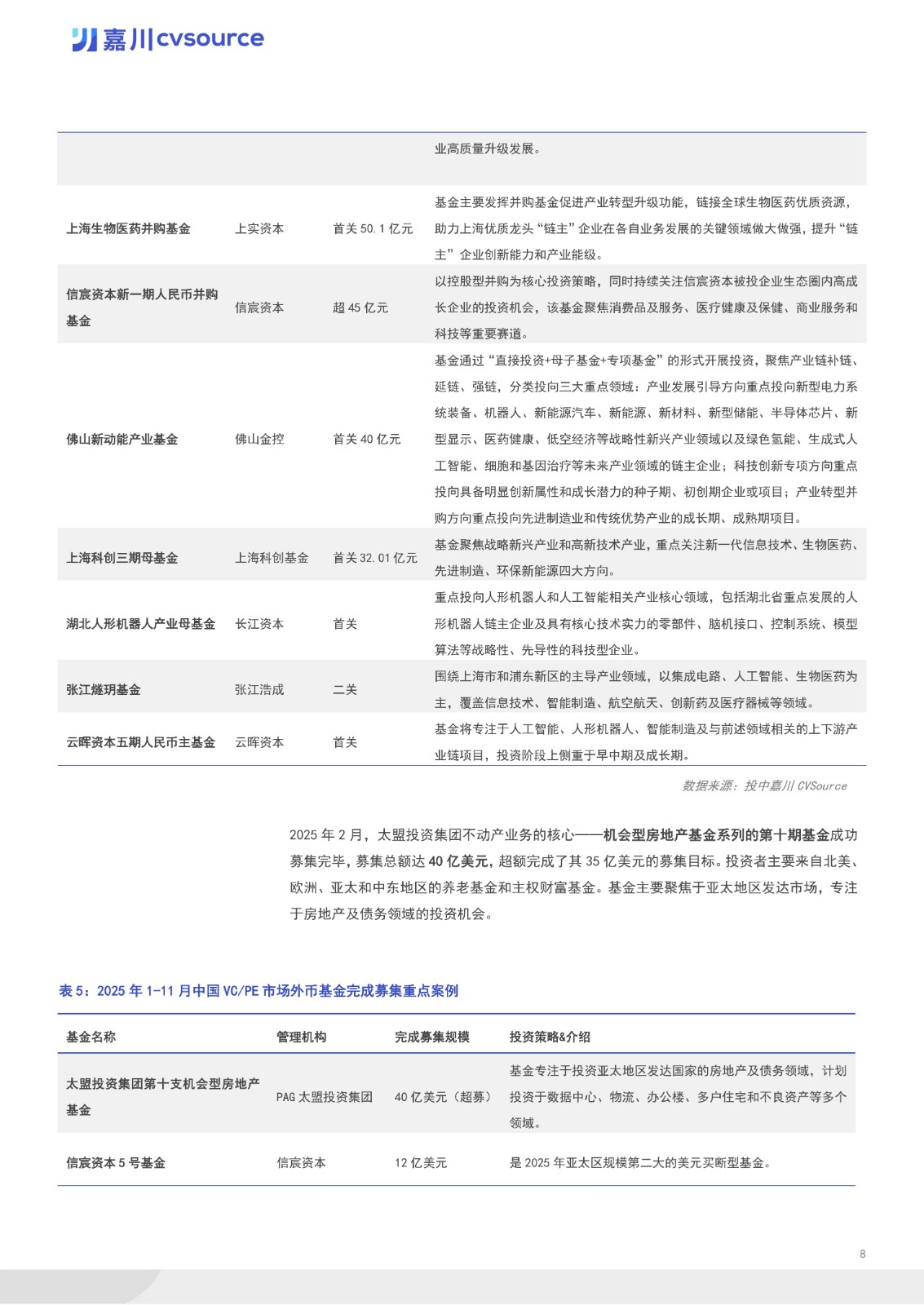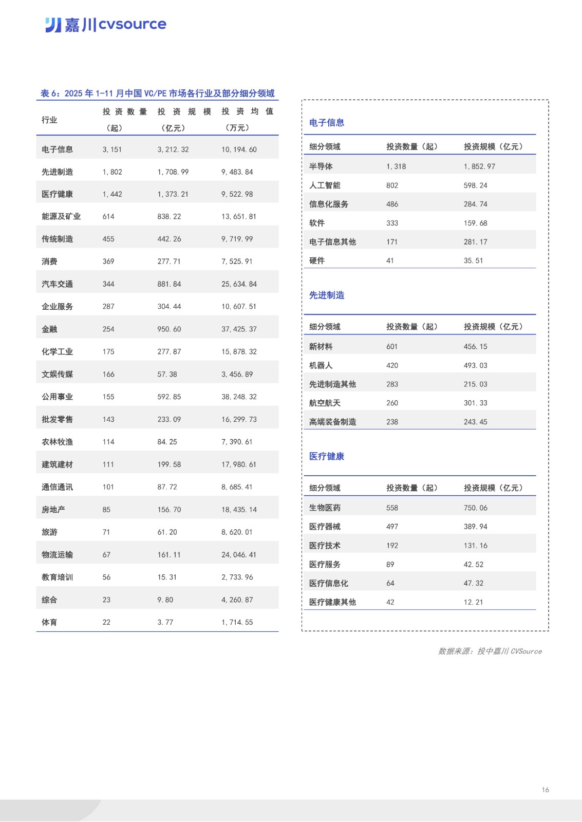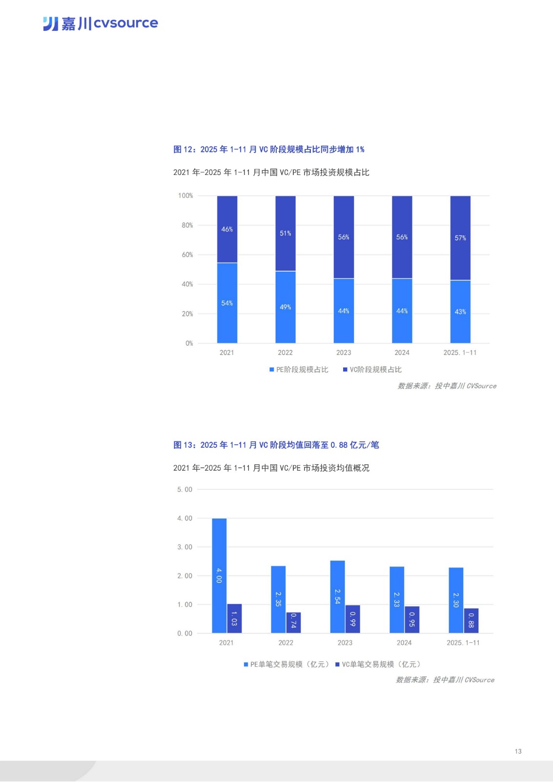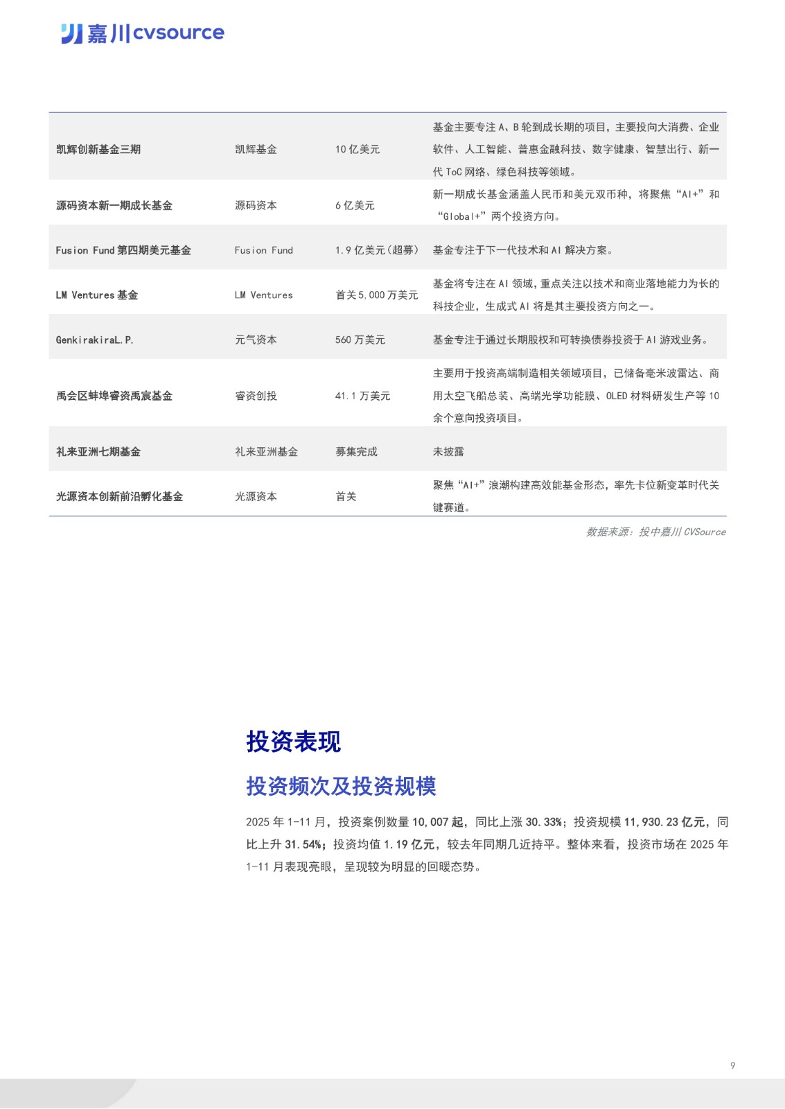 2025年1-11月,募投市场同比均有不同程度升温,募资数量同比增加16.73%,投资数量同比上涨30.33%。募资方面,机构活跃度同步增加,18.6%的机构完成3支及以上基金新设;浙江省新设基金数量超千支,嘉兴市对比全国呈翻倍式领先。投资市场,头部机构参投主体数量同比增加16.69%,17%的头部机构资金流向27%的项目。