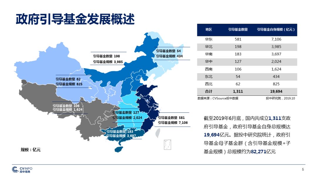 总规模:截至2019年6月底,国内共成立1,311支政府引导基金,政府引导基金自身总规模达19,694亿元。据投中研究院统计,政府引导基金母子基金群(含引导基金规模+子基金规模)总规模约为82,271亿元